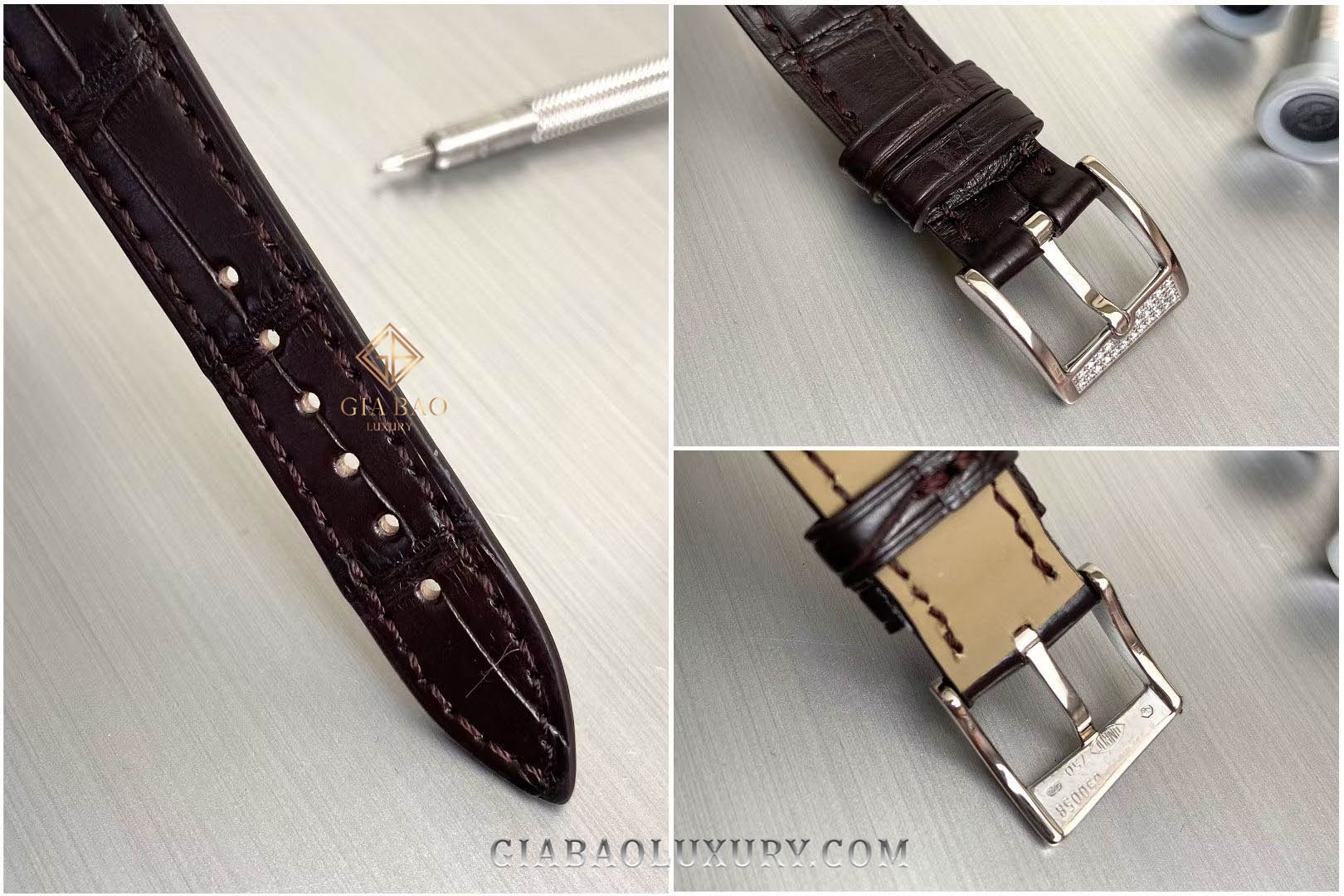 Đi cùng với bộ vỏ khung hoàn hảo là bộ dây đeo làm từ da cá sấu màu nâu mang vẻ đẹp cổ điển đặc trưng. Chất liệu da cá sấu mềm mại đem lại sự thoải mái cho người đeo được gia công cẩn thận với những đường chỉ may đều đặn, phần mặt sau được dập tên thương hiệu kèm các thông số của chiếc đồng hồ. Hoàn thiện bộ dây đeo là bộ khóa cài tiện lợi có đính kim cương và làm từ vàng trắng đồng bộ với bộ vỏ khung.