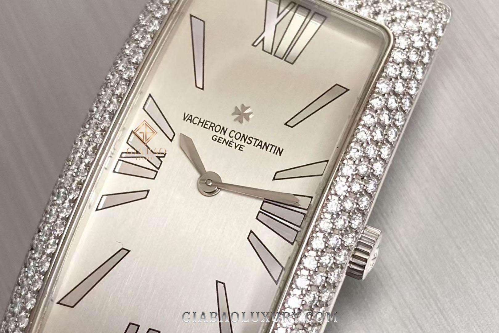 Mặt số đồng hồ nền trắng hiển thị chức năng báo giờ, phút với hệ thống cọc số La Mã màu bạc ấn tượng, viền đen sắc nét được theo dõi qua hai chiếc kim mạ vàng trắng đang vận hành nhịp nhàng ở trung tâm. Vì mặt số khá hẹp cộng với đây là một mẫu đồng hồ dresswatch dành cho nữ nên nhà sản xuất không quá chú trọng vào chức năng mà tập trung thể hiện sự tối giản và hiện đại cho mặt số mỗi khi ai đó nhìn vào. Và để tăng thêm sự tiện lợi, dễ dàng sử dụng, thương hiệu Vacheron Constantin đã sử dụng bộ máy quartz bền bỉ với khả năng vận hành chính xác cùng mức dự trữ năng lượng vượt trội, không cần phải lên cót, không lo hết năng lượng như các bộ máy cơ học trên thị trường.