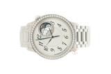 Chức năng Moonphase theo dõi chu kỳ mặt trăng được tích hợp ở góc 1 và 2h được giới hạn trong một vòng 36 viên kim cương – vẻ đẹp huyền ảo đến từ mặt trăng. Bên cạnh đó, vòng kim cương còn được trang trí những mảnh ngọc trai để tạo ra làn mây huyền ảo và thu nhỏ bầu trời vào chiếc đồng hồ của bạn.
