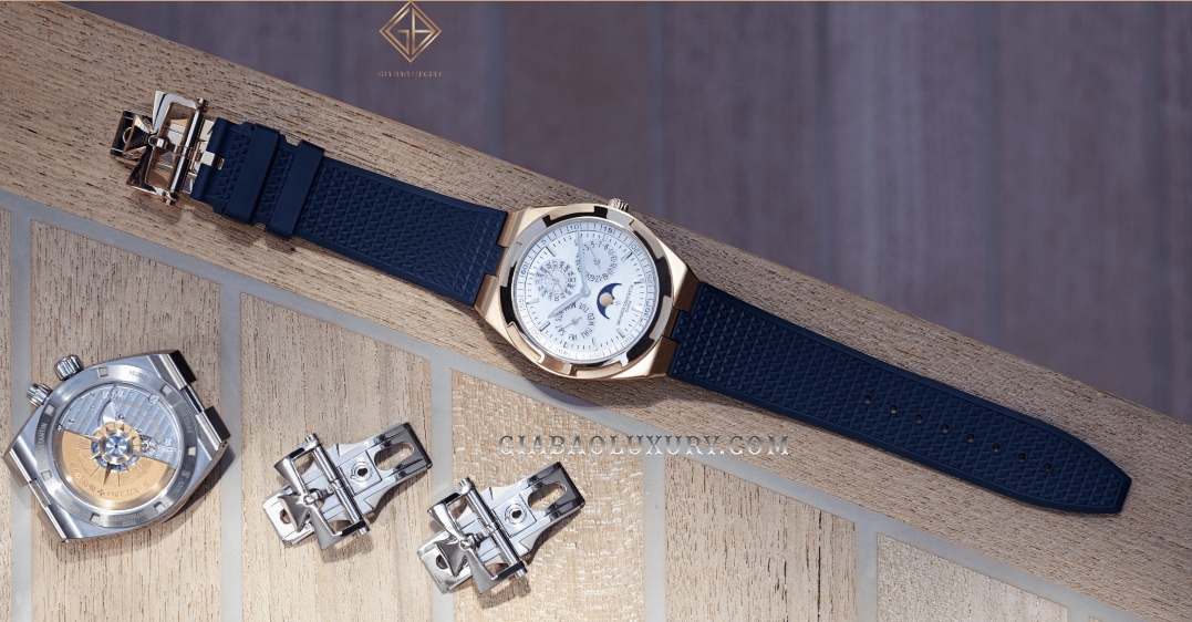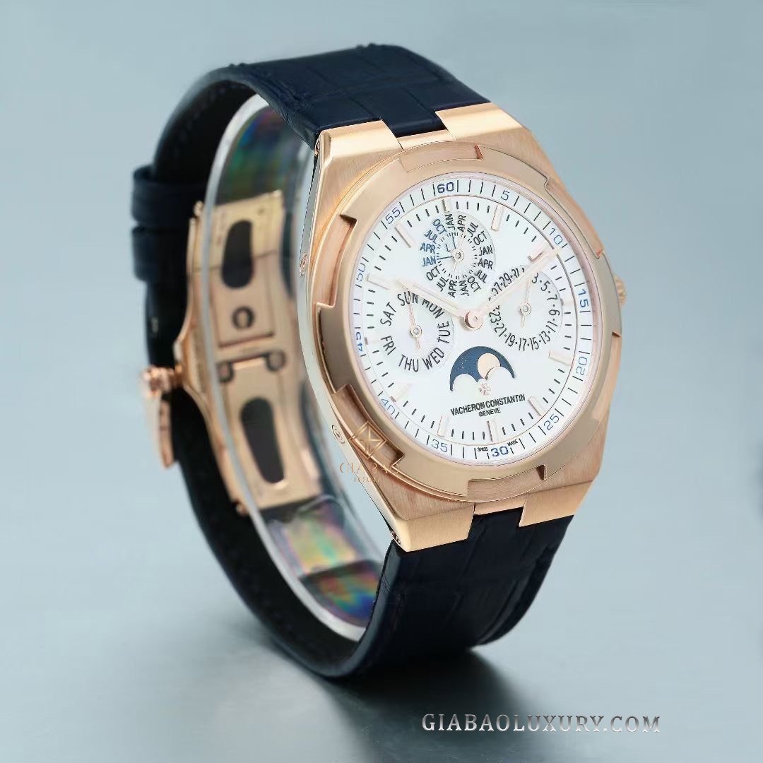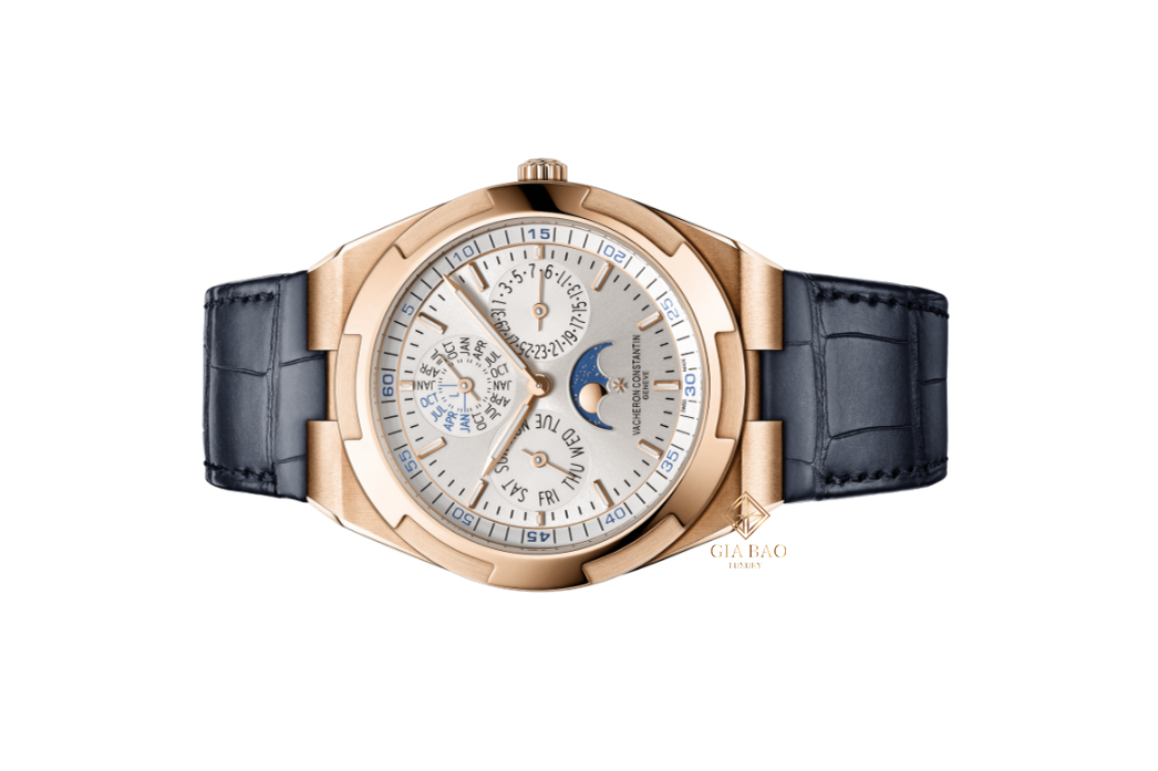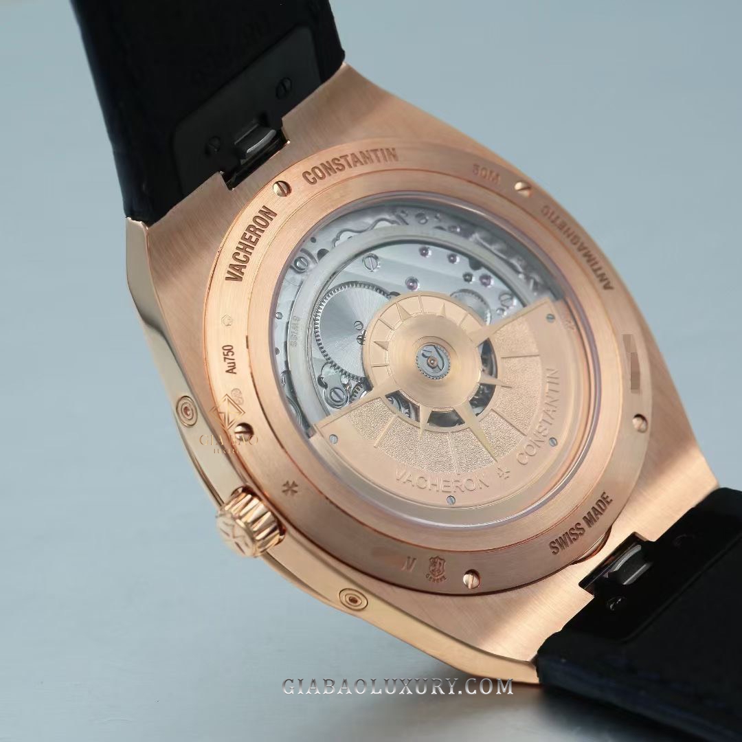 Chiếc đồng hồ được chế tác bằng vàng hồng 18K 5N có đường kính 41.5 mm và dày chỉ 8.1mm - rất mỏng cho chức năng lịch vạn niên phức tạp. Vành bezel của chiếc Vacheron Constantin Oversea được đánh bóng kết hợp với chải xước. Phần thân được hoàn thiện xước mờ, vát cạnh và đánh bóng tăng tính tương phản cho dáng vỏ thêm phần mạnh mẽ. Mặt trước và sau là 2 tấm kính Sapphire trong suốt cho phép chúng ta chiêm ngưỡng mặt số và cỗ máy một cách chân thực nhất. Chiếc đồng hồ đi kèm 2 dây: dây da cá sấu màu xanh đậm và dây cao su. Cơ chế thay dây thông minh nên chúng ta có thể tự thay 2 dây dễ dàng.