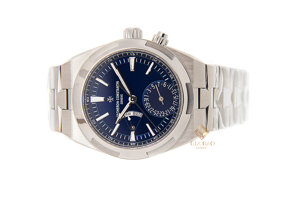 Tông màu xanh dương trên mặt số đồng hồ thực sự phù hợp với màu trắng bạc của thép, đem đến một thiết kế trầm đầy nam tính. Với chiếc Vacheron Constantin Overseas 7900V/110A-B334, chúng ta có tính năng GMT giúp hiển thị múi giờ thứ hai, được đặt trên cây kim ngắn có đầu hình mũi tên. Để phân biệt rõ ràng hơn về giờ sáng và giờ tối, Vacheron Constantin đã đặt thêm một chỉ báo AM/PM ở góc 9 giờ.