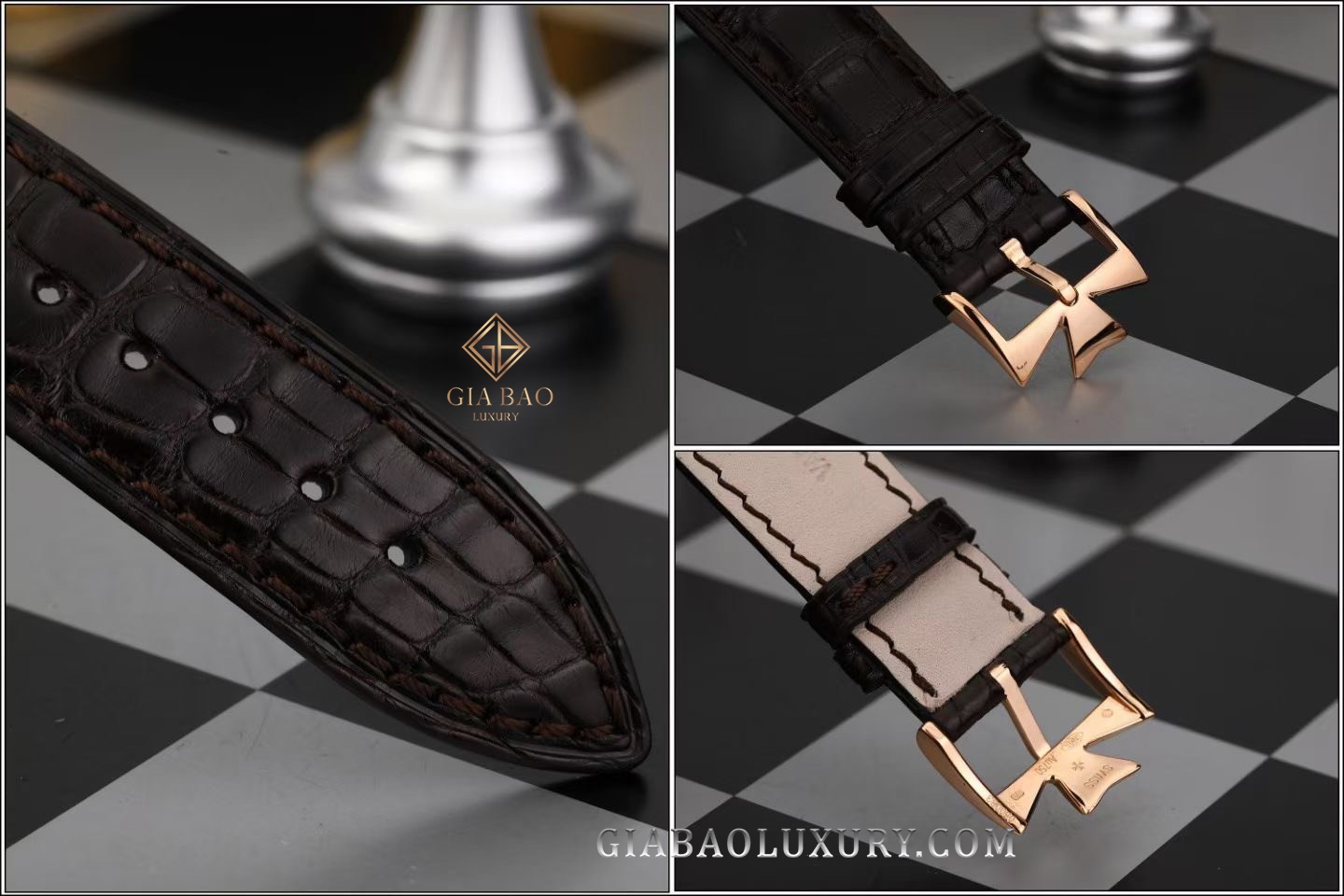 Dây đeo da cá sấu màu đen tương đồng với màu của mặt số. Da cá sấu với ưu điểm mềm và độ bền cao mang đến cảm giác thoải mái cho người sử dụng. Khóa cài kiểu ardillon với thiết kế đặc trưng của Vacheron Constantin được coi là một cách để nhận diện thương hiệu đồng hồ này.