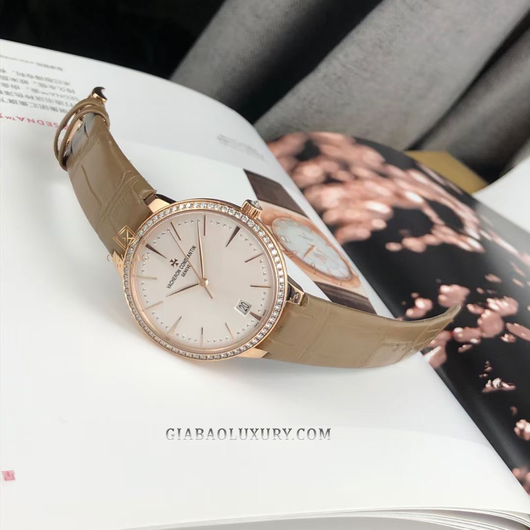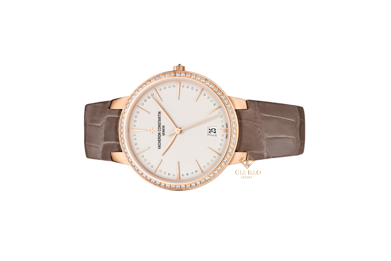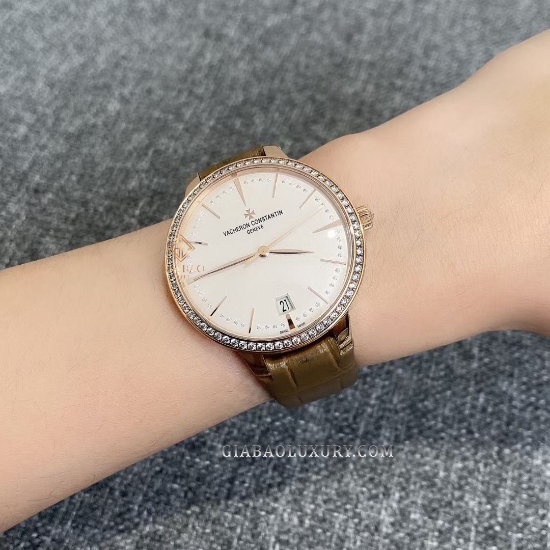 Tổng thể chiếc Vacheron Constantin Patrimony 85515/000R-9840 là sự kết hợp hài hòa giữa sắc vàng sang trọng của lớp vỏ vàng hồng, trắng của phần mặt số và nâu đỏ của dây đeo da cá sấu. Tất cả hòa quyện tạo thành một tuyệt phẩm trên cổ tay của những cô nàng cá tính và những quý ông thanh lịch.