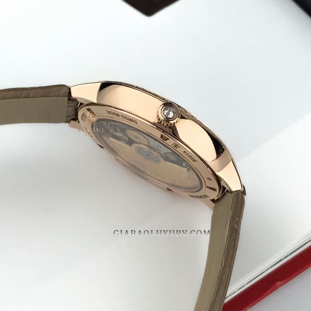 Ngay từ cái nhìn đầu tiên, Vacheron Constantin Patrimony 85515/000R-9840 gây ấn tượng, gây thương nhớ tới cho người mộ điệu bởi chi tiết đính kim cương trên vành bezel và chỉ báo phút trên mặt số của đồng hồ. Nhưng chưa dừng lại ở đó, Vacheron Constantin còn mạnh tay chi thêm để tăng phần hoàn mỹ cho siêu phẩm của mình với viên kim cương cỡ to đính ở phần nút chỉnh giờ.