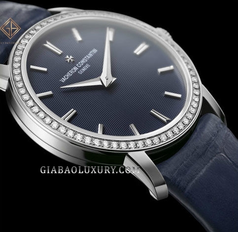 Hoàn thiện vẻ đẹp trang nhã cho tổng thể, nhà sản xuất đã trang bị cho phiên bản này dây đeo da cá sấu màu xanh sẫm - một màu sắc dễ phối hợp với nhiều loại trang phục, đem lại sự thoải mái cho người đeo và làm nổi bật cổ tay ngọc ngà của các quý cô. Tất nhiên, sự xuất hiện của chi tiết này đã củng cố thêm nét cổ điển, quý tộc và đầy sang trọng của thương hiệu đồng hồ cao cấp nổi tiếng như Vacheron Constantin.