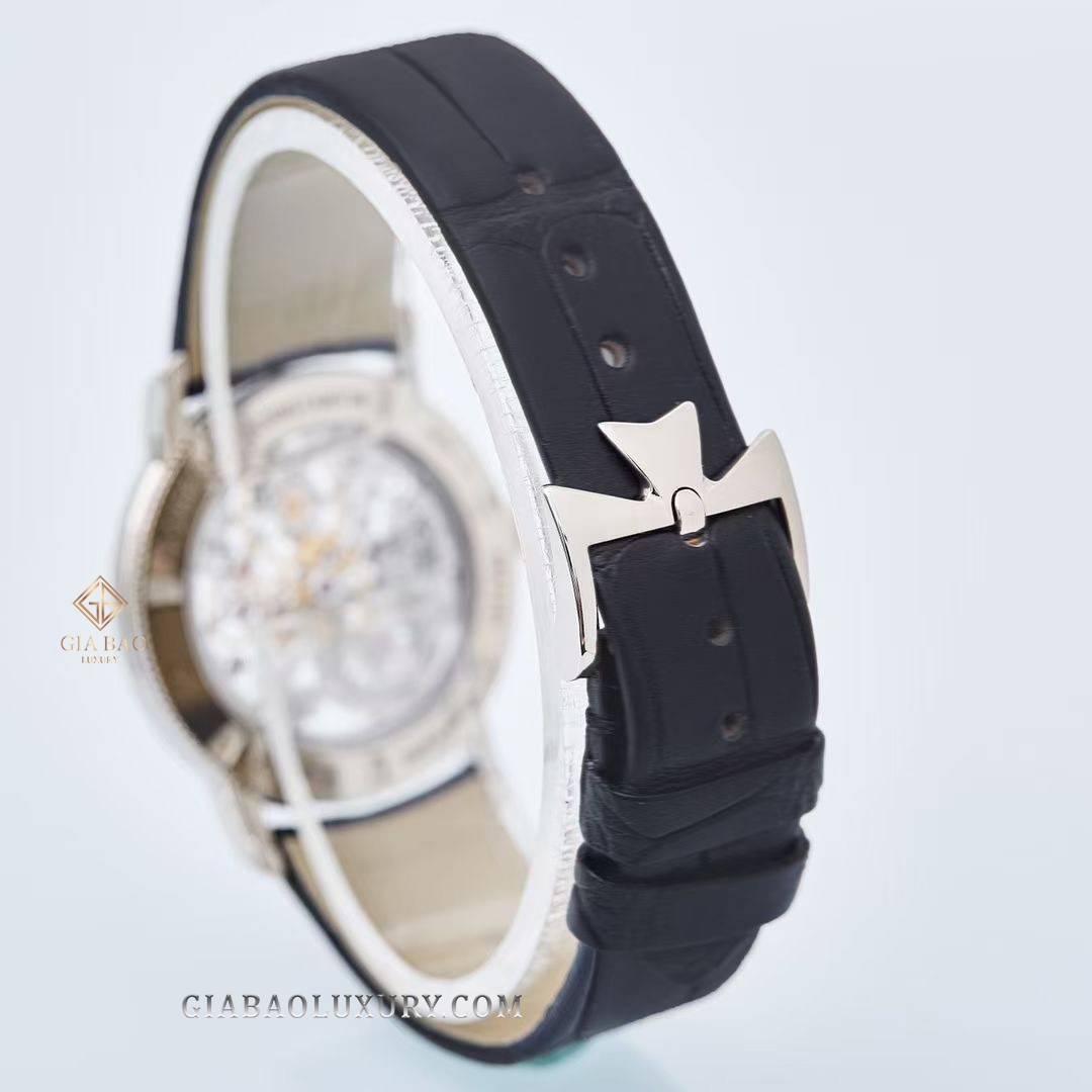 Dây đeo da cá sấu màu đen ôm trọn cổ tay của các quý cô giúp tạo cảm giác thoải mái khi sử dụng. Khóa dây đeo kiểu Ardillon được làm từ vàng trắng 18k với thiết kế phá cách, độc đáo mang đậm dấu ấn thiết kế của Vacheron Constantin.