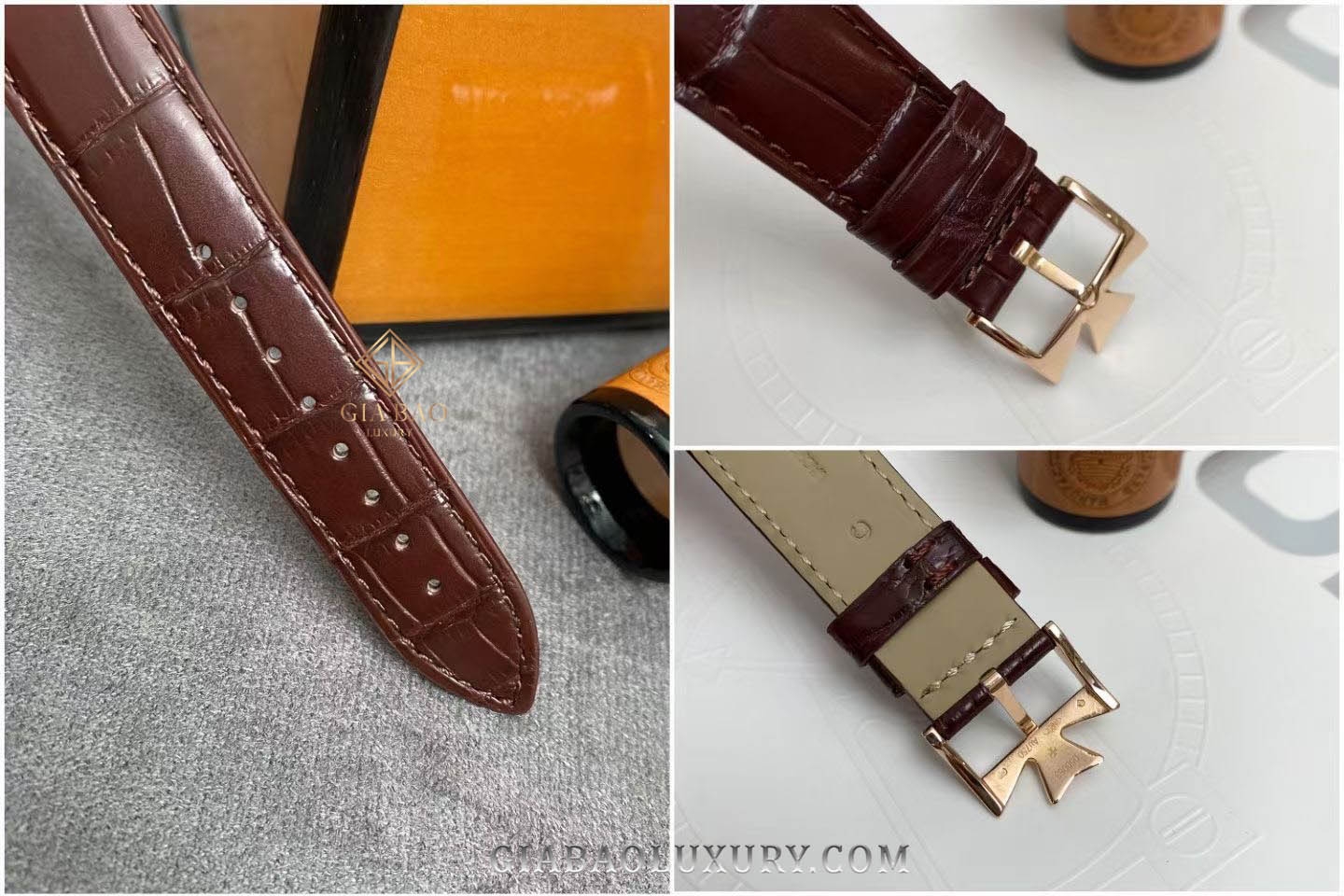 4 càng nối dây nhẵn bóng làm từ vàng hồng 18k 5N được nối với bộ dây bằng da cá sấu màu nâu. Bề mặt của dây đeo được làm bằng da cá sấu màu nâu với các đường vân tự nhiên vô cùng đẹp mắt. Vành bezel cũng làm từ vàng hồng 18k 5N và được đính 66 viên kim cương lấp lánh trong vô cùng quyến rũ.