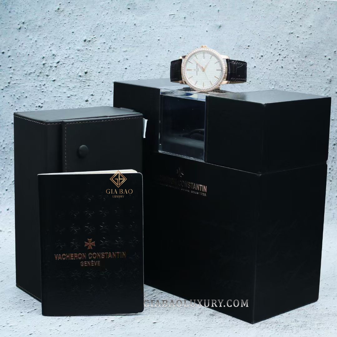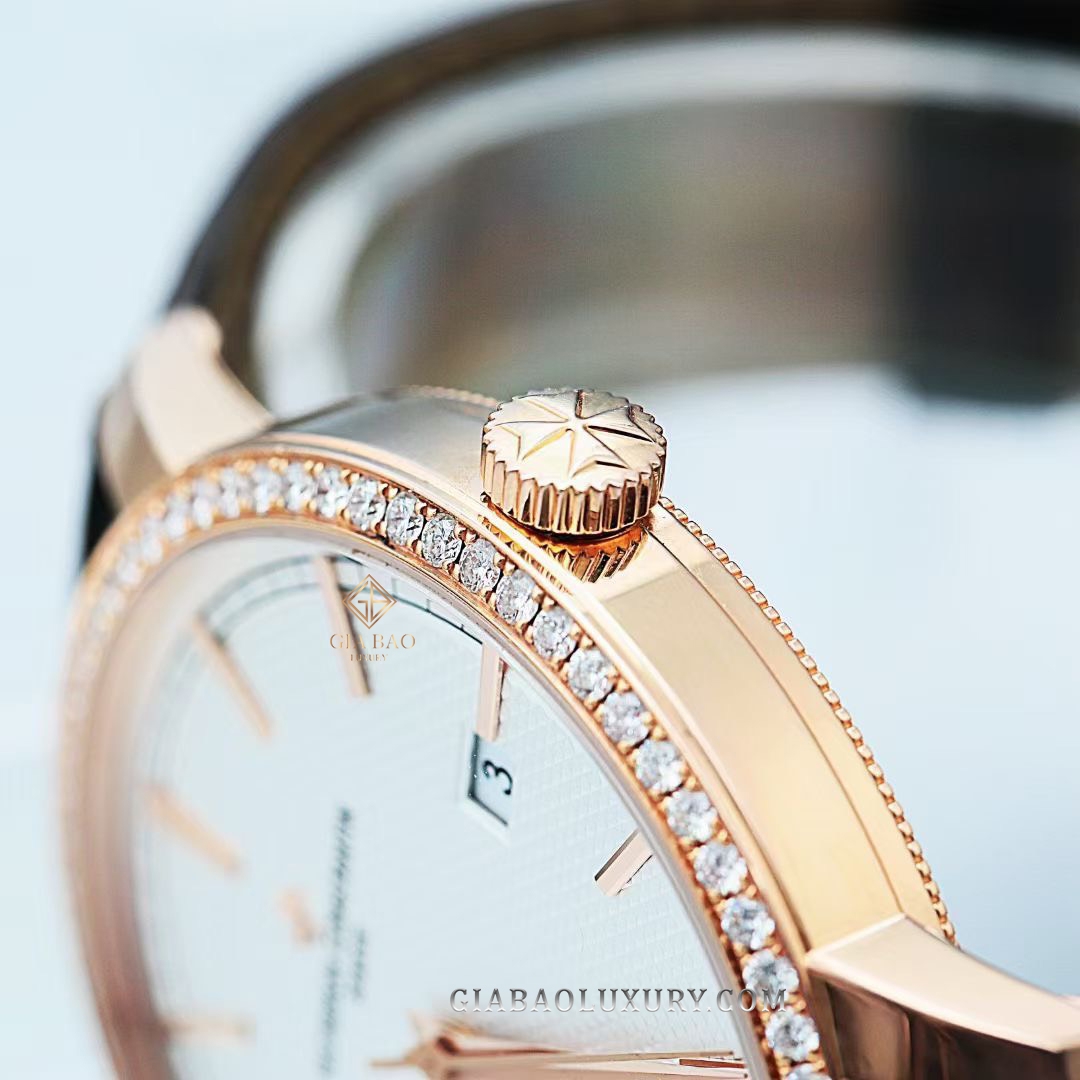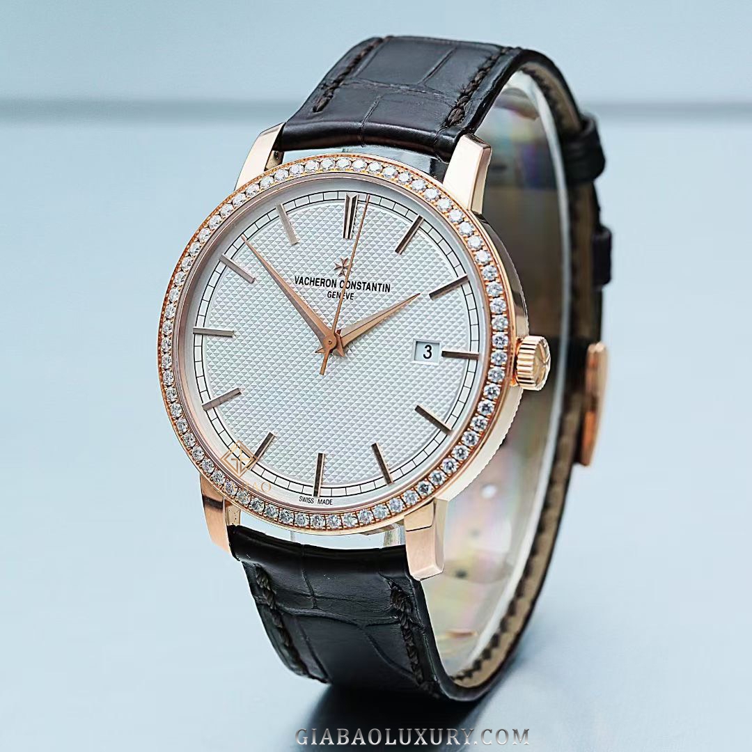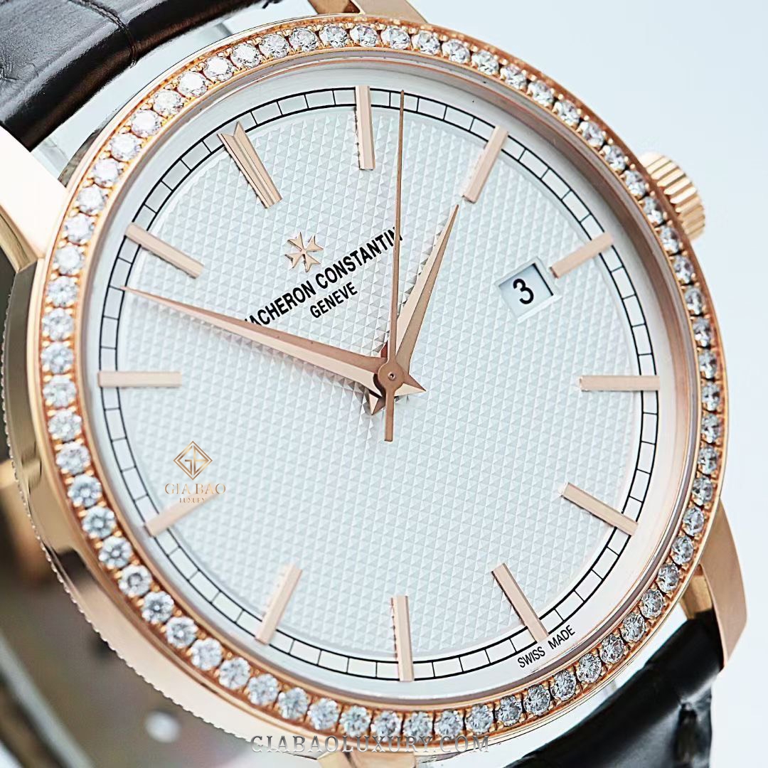 Nếu chất liệu vàng khối chưa đủ để làm bạn hài lòng, chiếc Vacheron Constantin Traditionnelle 85520/000R-9850 còn có thêm vành bezel bằng kim cương quý giá. Những viên đá quý được sử dụng hết sức tinh tế, với số lượng vừa đủ để làm cho bộ vỏ trở nên nổi bật như không quá phô trương.