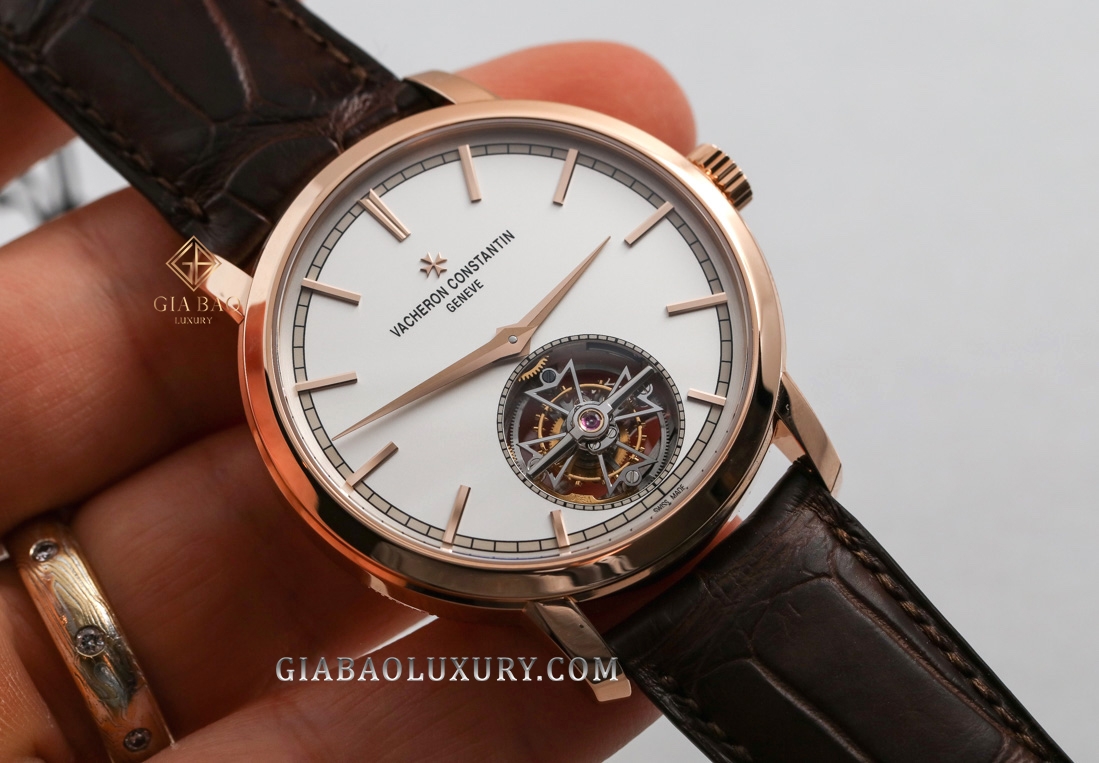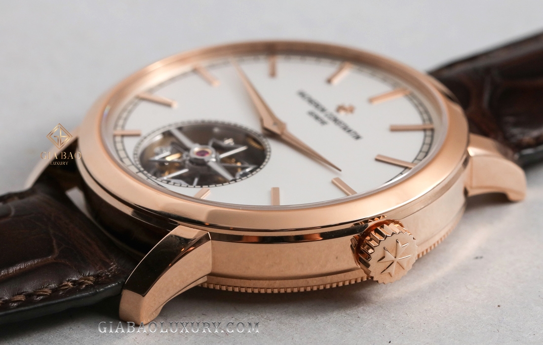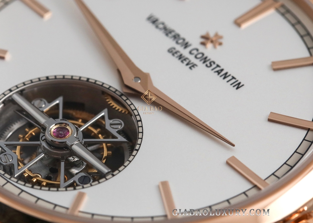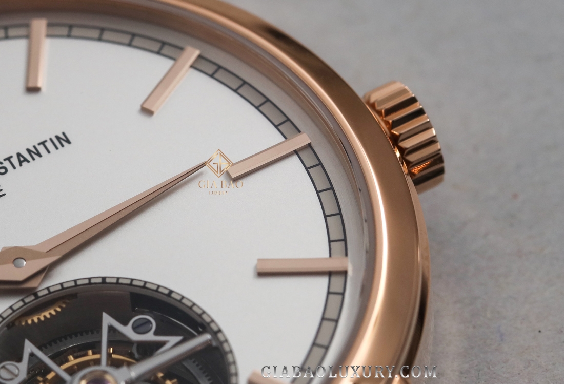 Đường ray đếm phút nằm bên ngoài rìa mặt số và xen kẽ với đó là những cọc chỉ giờ bằng vàng hồng được đính nổi, cùng tên thương hiệu và logo thánh giá Maltese nằm góc 12 giờ đồng hồ. Chiếm phần lớn diện tích và nổi bật nhất chắc chắn là lồng tourbillon nằm tại góc 6 giờ đồng hồ. Lồng tourbillon sẽ chuyển động không ngừng và nhằm ghi dấu ấn tới giới chế tác, nhà sản xuất đã tạo hình khung lồng tourbillon bằng kiểu dáng chính là thánh giá Maltese - biểu tượng của thương hiệu Vacheron Constantin.