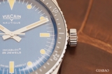 Giới thiệu Đồng hồ đeo tay thương hiệu Vulcain, dòng sản phẩm Skindiver, Ref no: 660170A37.BAC201, mặt số màu xanh dương size 38mm, máy tự động, vỏ đồng hồ thép không gỉ 316L, dây da bê màu đen, hàng mới 100%