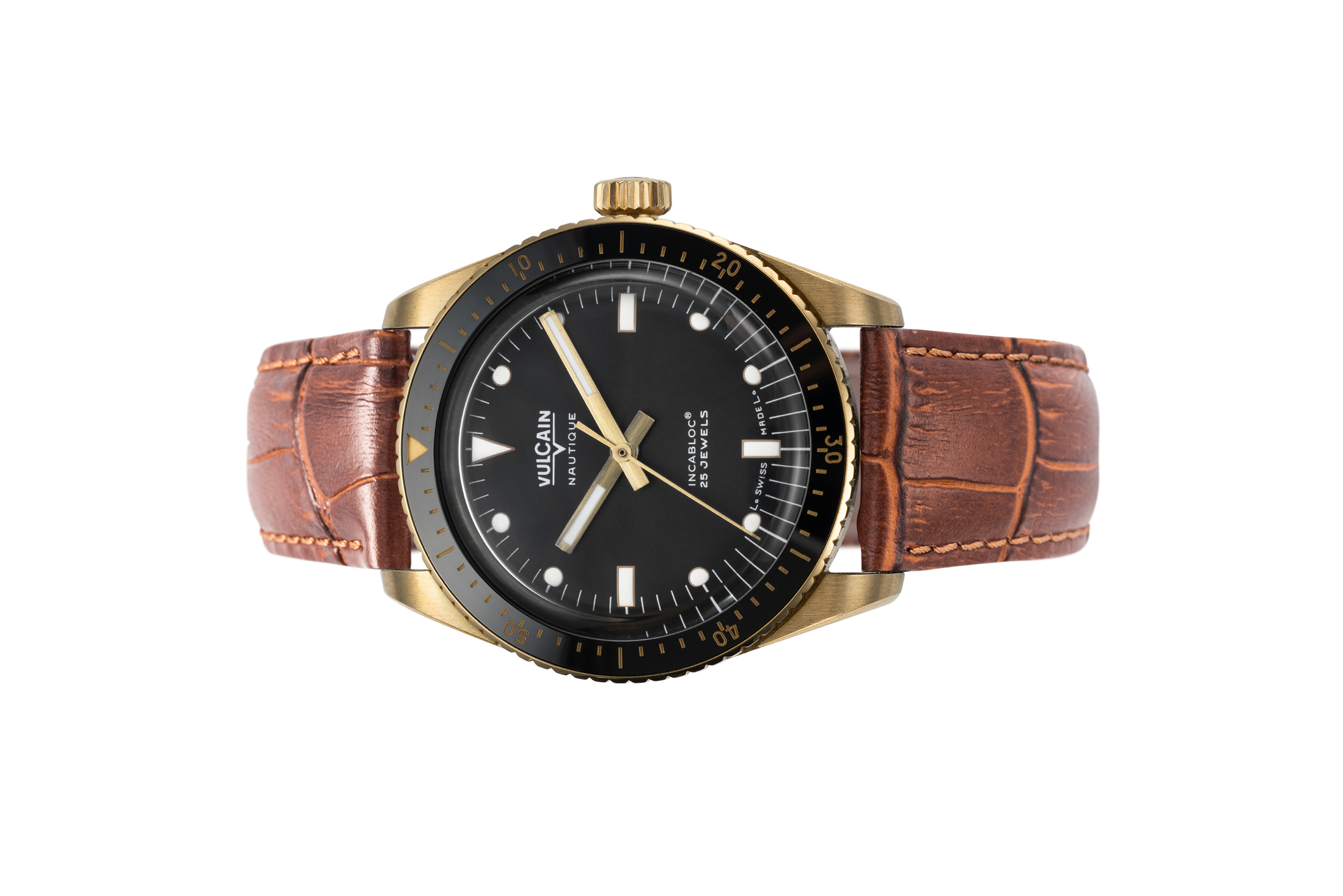Đồng hồ đeo tay thương hiệu Vulcain, dòng sản phẩm Skindiver, Ref no: 662170A07, mặt số màu đen, size 38mm, máy tự động, vỏ đồng hồ bằng đồng, dây da bê, hàng mới 100%