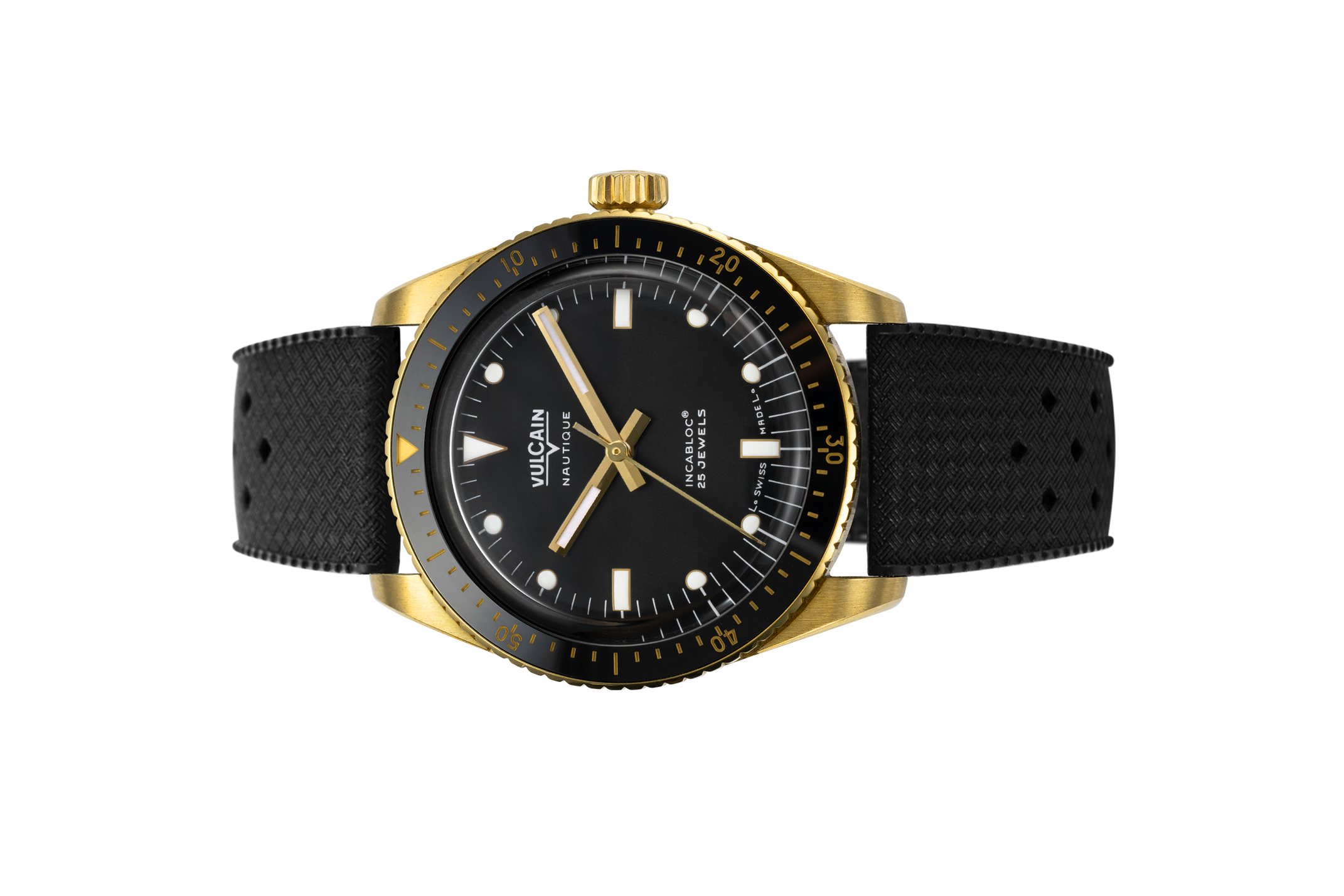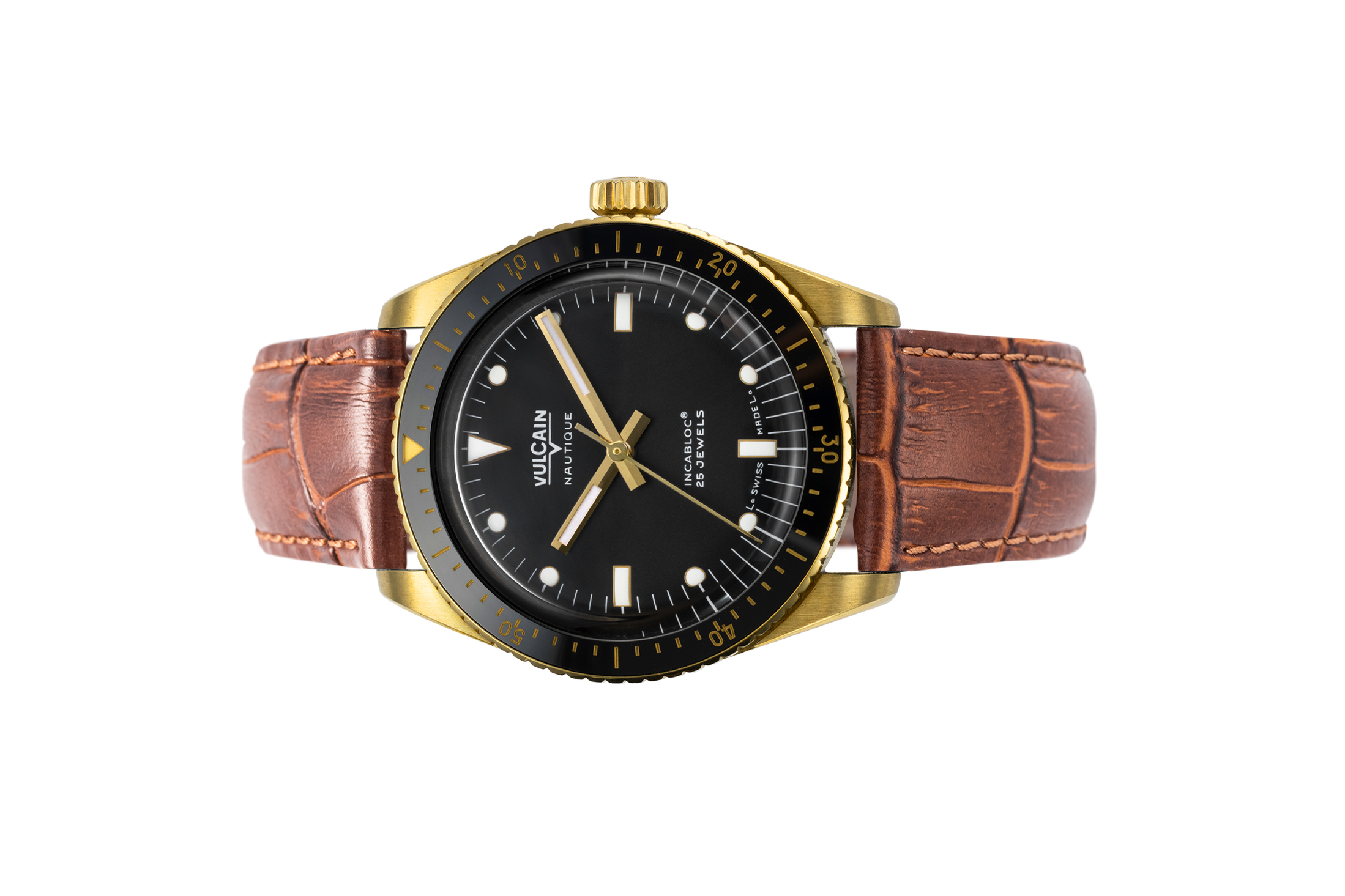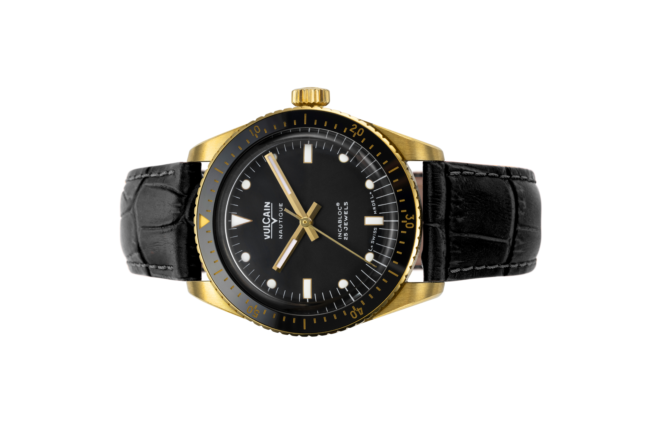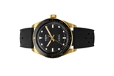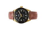 Giới thiệu Đồng hồ đeo tay thương hiệu Vulcain, dòng sản phẩm Skindiver, Ref no: 661170A07, mặt số màu đen, size 38mm, máy tự động, vỏ đồng hồ vàng vàng 18k, dây da bê, hàng mới 100%