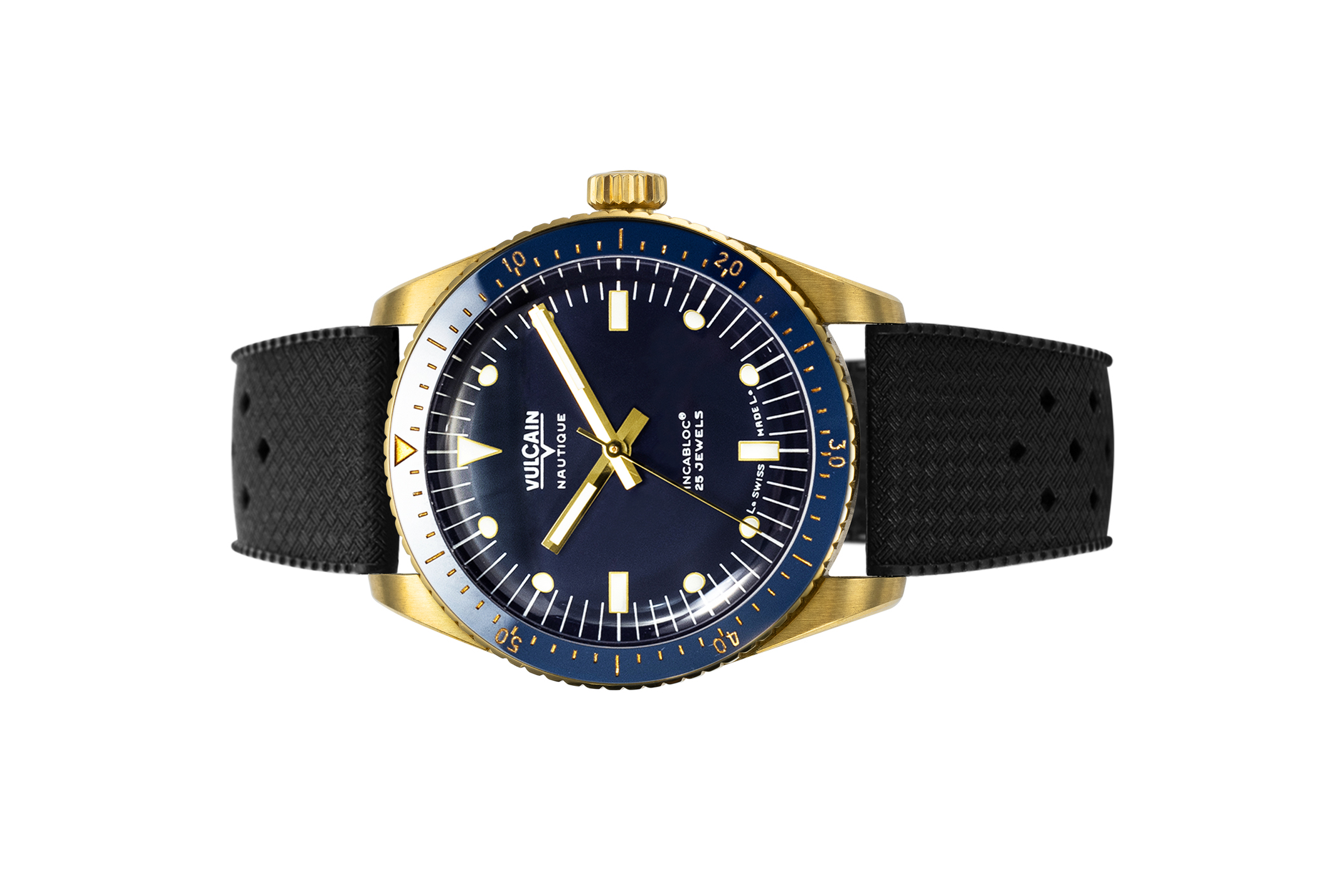 Nhìn vào Skindiver Nautique, bạn sẽ bị thu hút bởi vỏ đồng hồ có tông vàng (có thể là mạ PVD màu vàng, hoặc hợp kim đặc biệt), kết hợp với bezel (vòng benzen) và mặt số xanh dương đậm. Sự tương phản giữa xanh – vàng ngay lập tức tạo ấn tượng cao về mặt thẩm mỹ, khiến chiếc đồng hồ dễ nhận ra. Đường kính (thường dao động 38–41mm tùy phiên bản) tạo hình dáng gọn, chuẩn “skindiver” cổ điển, mang tinh thần những chiếc đồng hồ lặn thập niên 50–60. Từng chi tiết kim, cọc số phủ dạ quang hoặc sơn phản quang (tùy phiên bản), đảm bảo khả năng xem giờ rõ ràng. Logo Vulcain đặt ngay dưới 12 giờ cùng dòng chữ “Nautique 25 Jewels” gợi nhớ truyền thống chế tác máy cơ tinh xảo.