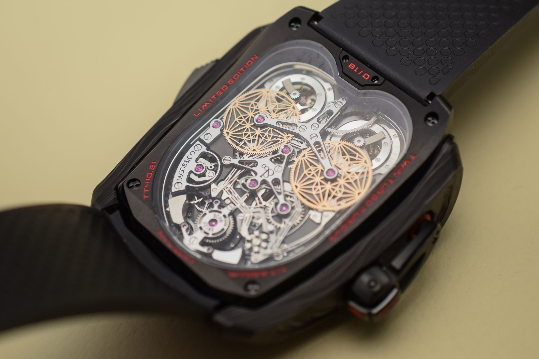 Xuất hiện tại sự kiện triển lãm Baselworld 2018, chiếc đồng hồ Jacob & Co. Twin Turbo Furious đã tạo ra nhiều điều bất ngờ, một chiếc đồng hồ đặc biệt điên rồ. Jacob & Co. Twin Turbo Furious có bộ đôi tourbillon bên cạnh những tính năng rất phức tạp ngay trên mặt số như mặt số phụ đếm giờ, điểm chuông hay chỉ báo dự trữ năng lượng. Thậm chí, không phải lồng tourbillon thông thường, 2 lồng tourbillon trên đồng hồ Jacob & Co. Twin Turbo Furious đều xoay theo 3 trục khác nhau, đưa chiếc đồng hồ trở nên sống động hơn bao giờ hết.