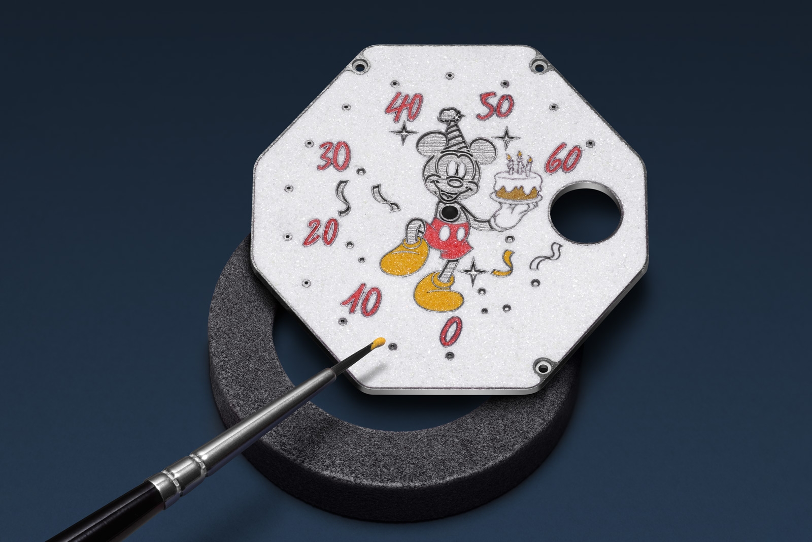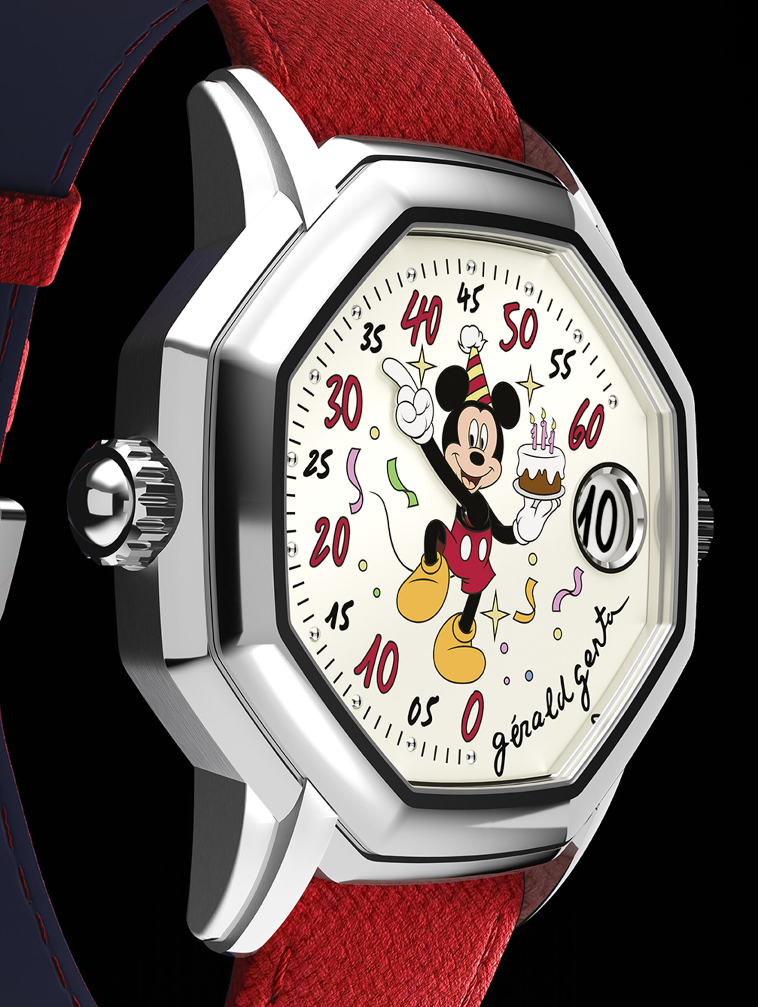 Đồng hồ Gerald Genta Mickey Mouse Minute Repeater có mặt số tráng men champlevé là bức tranh chú chuột Mickey mỉm cười đang cầm chiếc bánh sinh nhật trên tay. Theo truyền thống trên những chiếc đồng hồ Gérald Genta, một trong những cánh tay của Mickey là kim phút dạng retrograde (bật ngược), giờ được biểu thị trong cửa sổ ở vị trí ba giờ.
