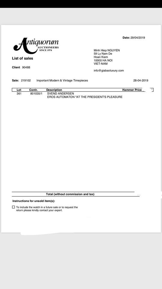 Trong phiên đấu giá của Antiquorum vào ngày 28/4/2019 vừa qua, Gia Bảo Luxury cũng tham dự với một thiết kế đặc biệt của thương hiệu đồng hồ độc lập Andersen Geneve. Mẫu đồng hồ Andersen Geneve Eros Automation "At The President's Pleasure" sở hữu cơ chế rối cơ khí độc đáo.