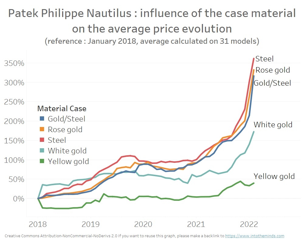 Nautilus thép đã tăng 361% từ năm 2018 đến mức cao nhất vào tháng 2 năm 2022. Con số này nhỉnh hơn một chút so với 332% của vàng hồng và 316% của sự kết hợp giữa vàng/thép. Về mặt định giá, thời điểm giá bắt đầu tăng là từ tháng 11 năm 2020.