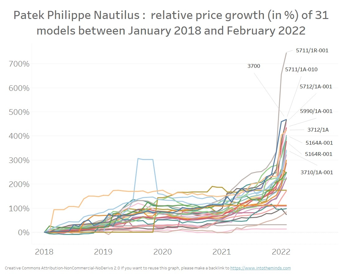 Nautilus 5711/1R-001 được đề cập trong đoạn trên đã tăng giá lên 744%, vượt xa các model khác (hầu hết là bằng thép):