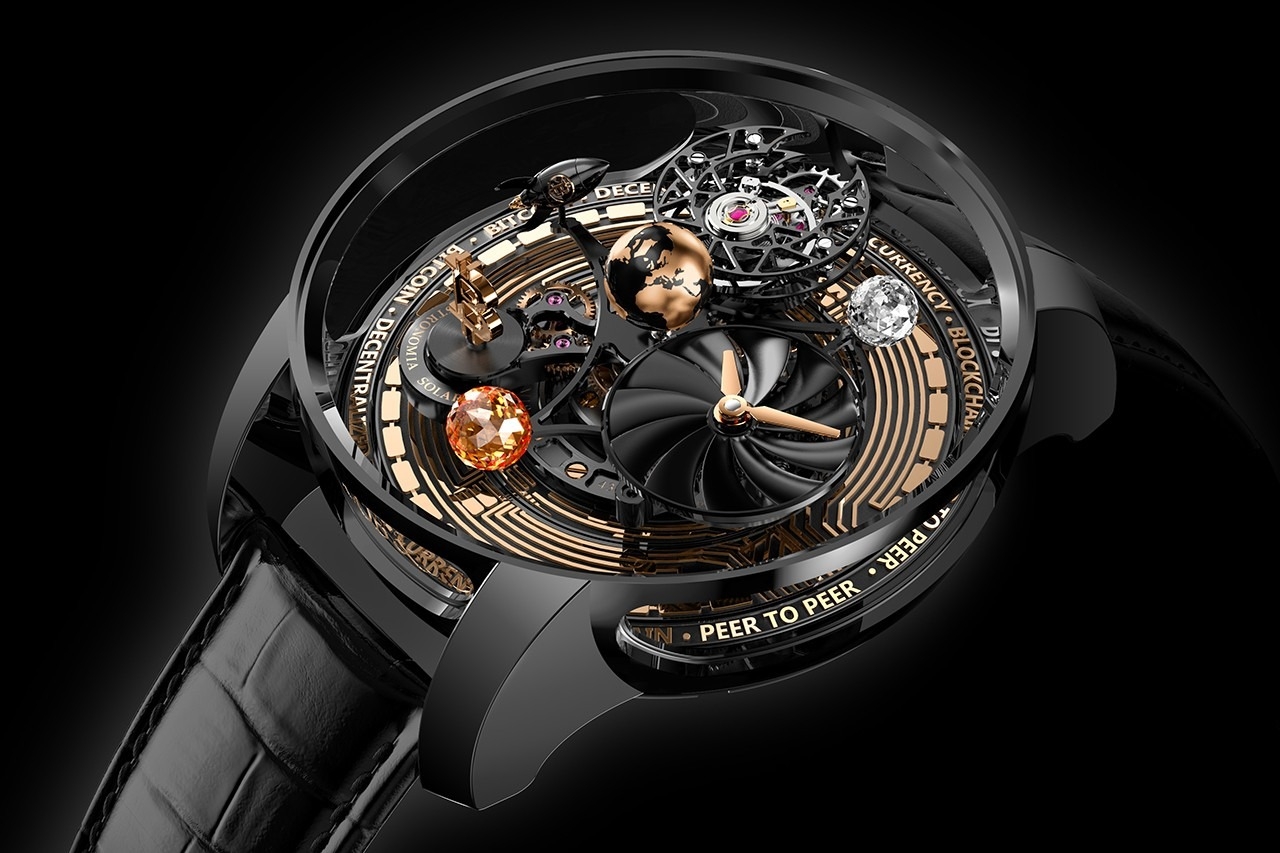 Bằng cách đặt các chi tiết liên quan đến tiền điện tử trong bộ máy đồng hồ mới, thương hiệu Jacob & Co. đã tạo ra một chiếc đồng hồ có nhiều ý nghĩa. Ngoài giữ tinh thần của một chiếc Astronomia truyền thống, có viên kim cương cỡ lớn, trái đất dạng sơn mài, cỗ máy mới ra còn được bổ sung thêm hệ thống chữ gồm có “peer to peer”, “Blockchain”, “Bitcoin” và cả “decentralized digital currency” phía bên dưới.
