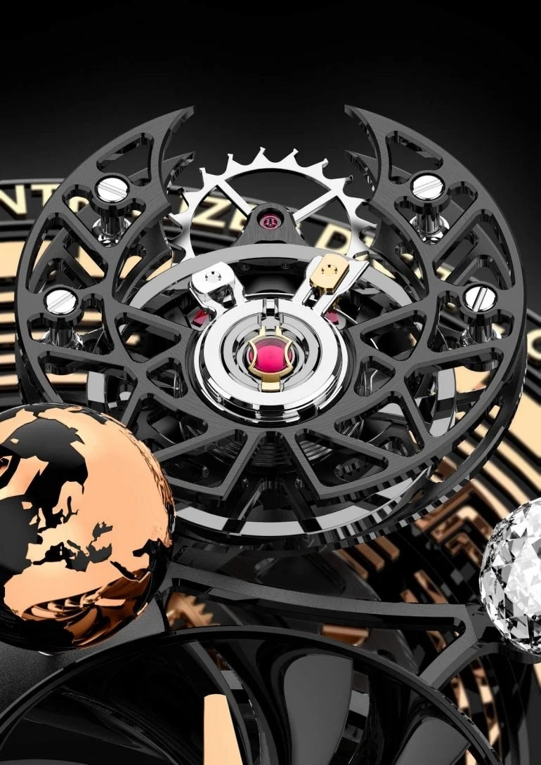 Tiến vào bên trong, Astronomia Solar Bitcoin sẽ khơi gợi trí tò mò của một thế hệ đang chịu ảnh hưởng mạnh mẽ của tiền điện tử. Mặt số đồng hồ lấy màu đen làm nền tảng, với rất nhiều chi tiết có quan hệ trực tiếp đến đồng tiền Bitcoin, ví như chữ B bằng vàng sáng bóng. Mặt số đồng hồ còn có một lồng flying tourbillon, viên đá sapphire màu vàng cam đại diện cho Mặt trời, kim cương trắng đại diện cho Mặt trăng, tên lửa hướng đến Mặt trăng. Tất cả sẽ xoay đều quanh Trái Đất có màu đen-vàng đặt tại trung tâm.