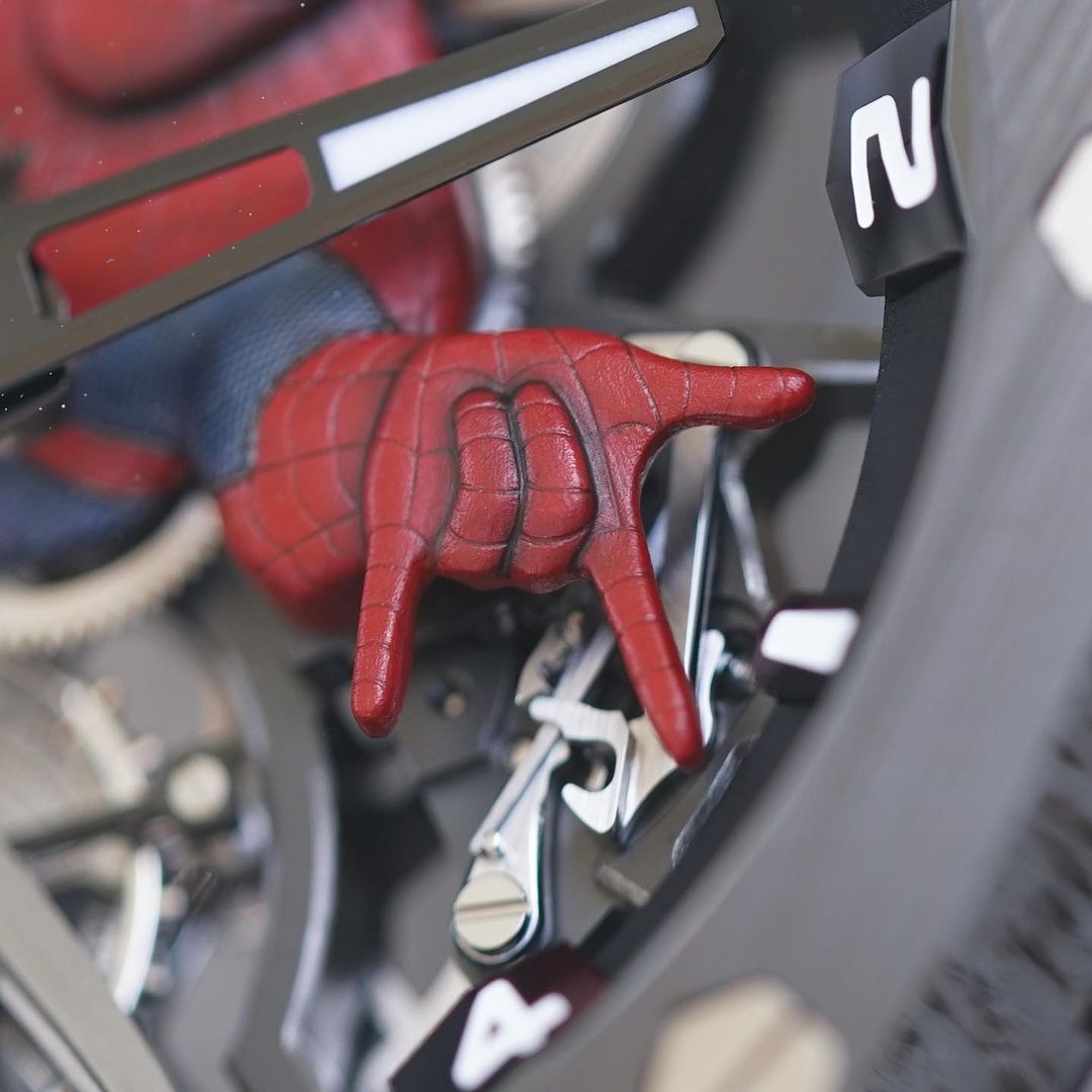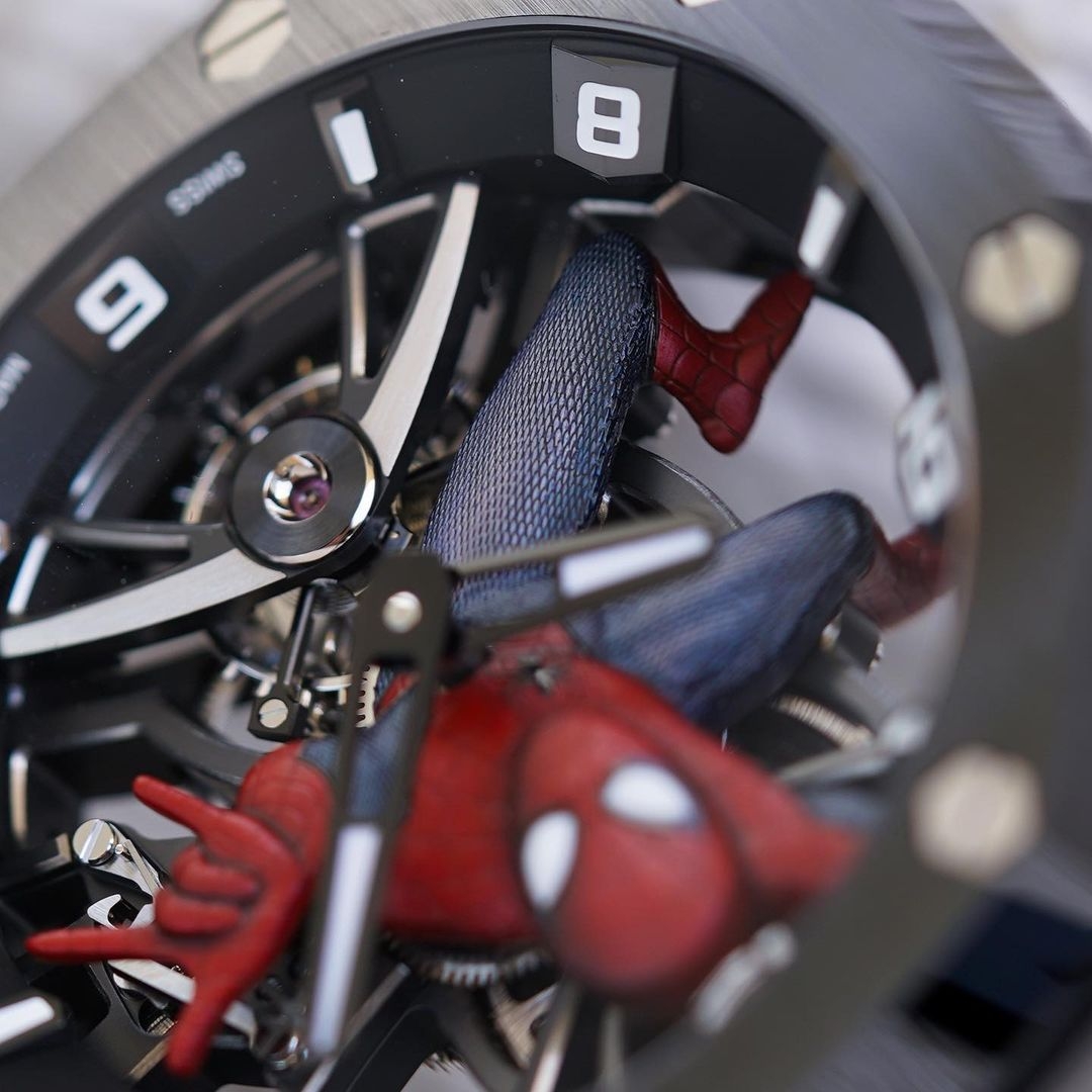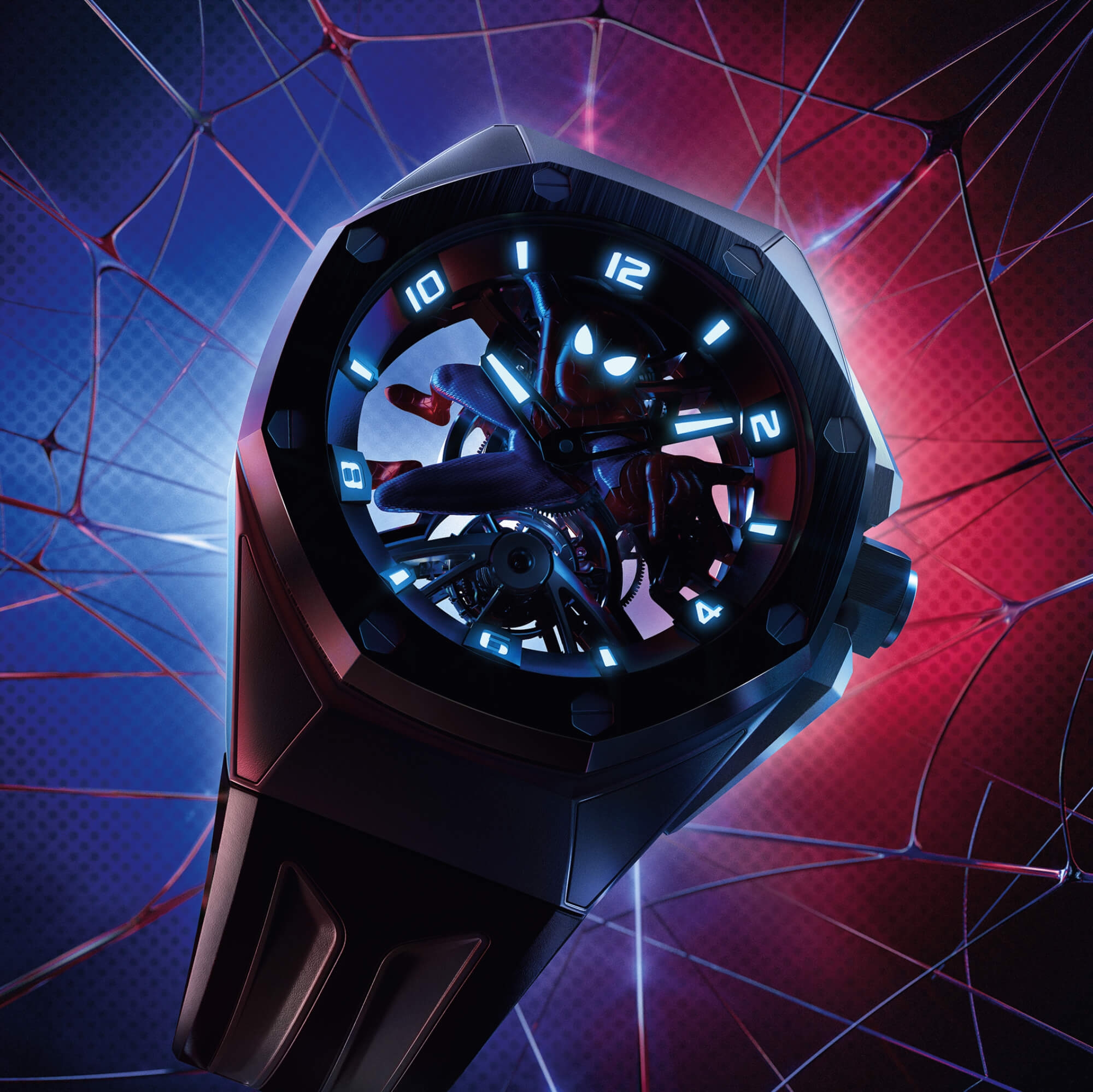 Trung tâm của sự chú ý là Người Nhện thu nhỏ chiếm một diện tích lớn ở phía trước mà Audemars Piguet cho biết là hãng đã dành ra không dưới 50 giờ làm việc để hoàn thiện. Người Nhện được thể hiện một cách chân thực đến kinh ngạc. Hình bóng của siêu anh hùng được gia công bước đầu từ một khối vàng trắng. Bộ đồ của anh ấy sau đó được tạo họa tiết bằng khắc laser. Các bước hoàn thiện liên quan đến chạm khắc được thực hiện tỉ mỉ bằng tay bởi một nghệ nhân duy nhất, trước khi được sơn bằng tay, làm cho mỗi tác phẩm trở nên độc đáo. Kết quả là Người Nhện có thể quan sát được cả ở hai mặt đồng hồ. Theo đó, hình ảnh bàn chân của siêu anh hùng là một chi tiết đẹp.