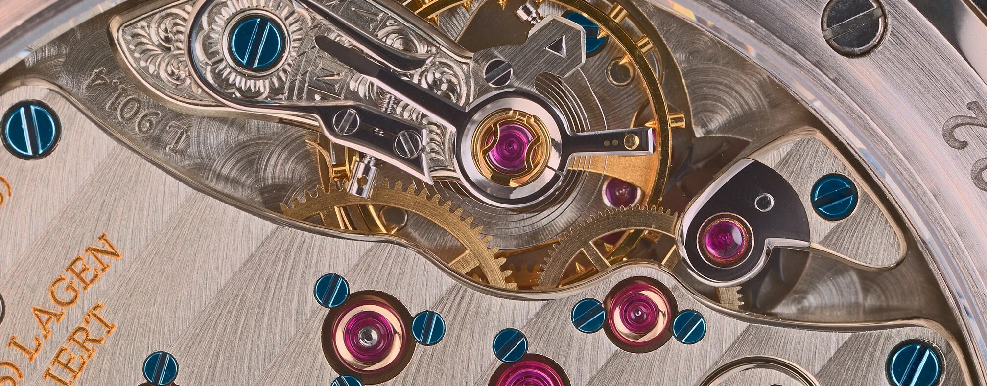 Chính lần sửa đổi này đặt nền tảng cho “dấu ấn bộ máy” (movement identity) của A. Lange & Söhne: tấm khung ba phần tư bằng German Silver, ốc vặn xanh, chaton vàng, họa tiết sọc Glashütte (rộng hơn kiểu Geneva), và cầu cân bằng chạm khắc thủ công (hand-engraved). Một cách hiện đại để tôn vinh truyền thống 150 năm.