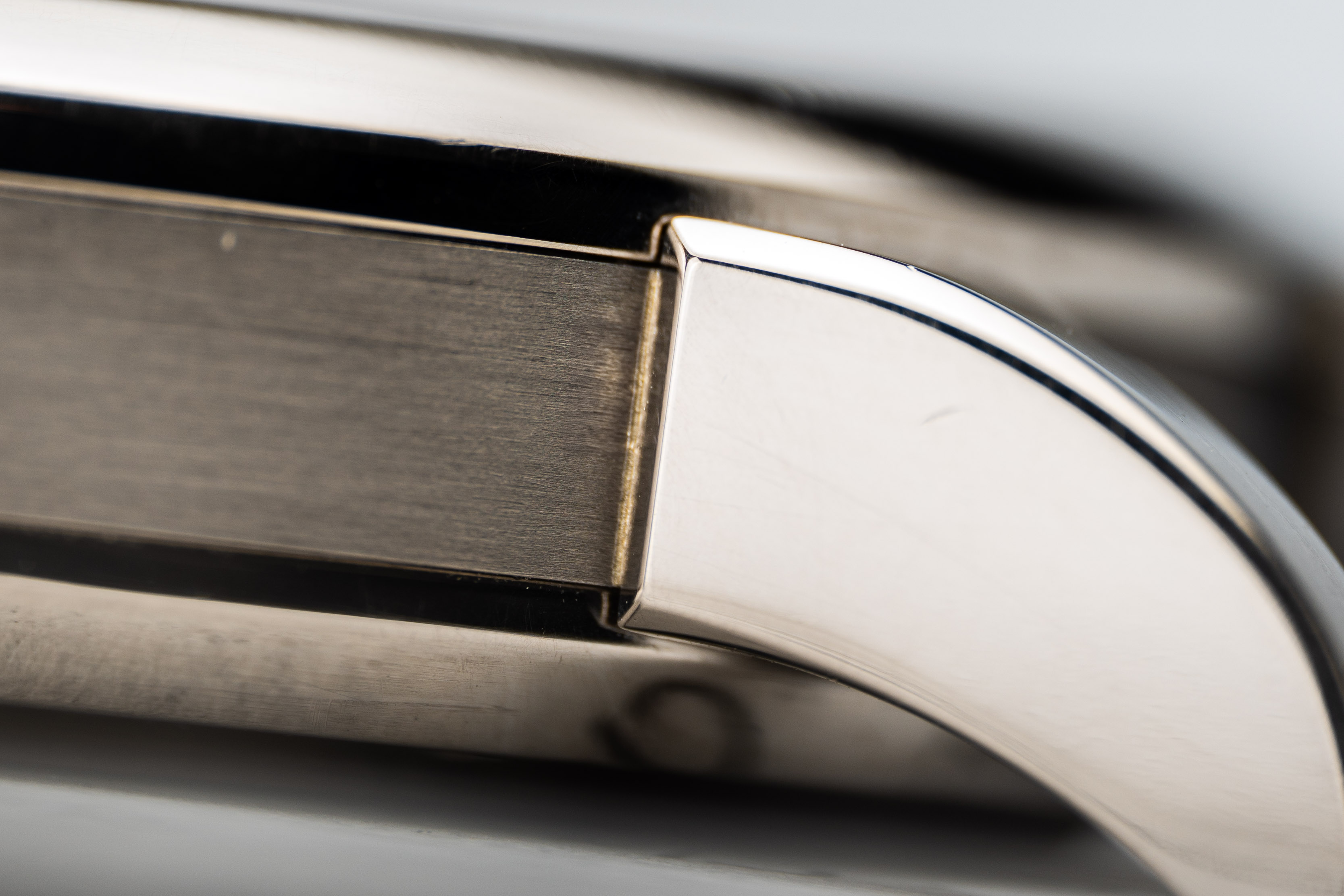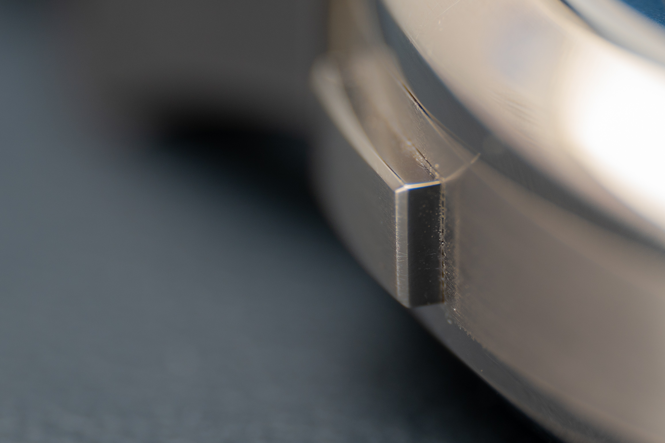 Ở rìa của những tai càng đều là những điểm vát rất nhỏ sau đó được đánh bóng. Tuy nhiên đa phần những phiên bản 101.xxx hiện nay trên thị trường đa phần đều bị "Spa" (thuật ngữ để nói về việc xử lý lại những vết xước trên đồng hồ cũ) một cách quá đà và không tôn trọng nguyên bản. Đó là lí do những nút bấm ấy đa phần hiện nay đều bị đánh bóng mòn đi và mất đi góc "vát" nguyên bản. Tương tự với những tai càng của Lange 1. Thật sự rất đáng tiếc.