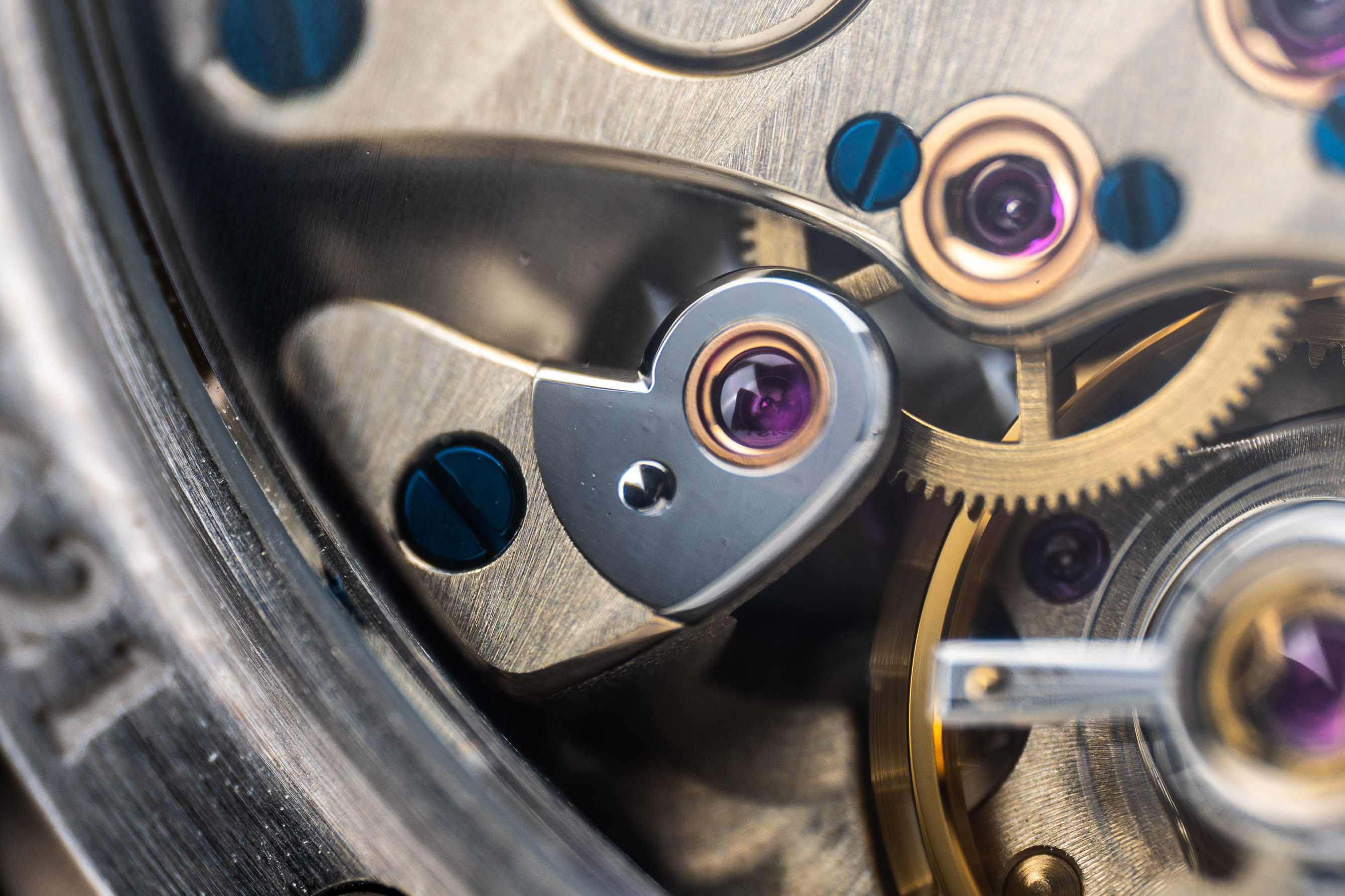 Hình ảnh bởi Gia Bảo: chi tiết “inward angle” (góc vào) trên cầu neo giữ bánh xe gai (escape wheel cap) được đánh bóng gương phẳng cũng phản ánh mức độ thủ công cao