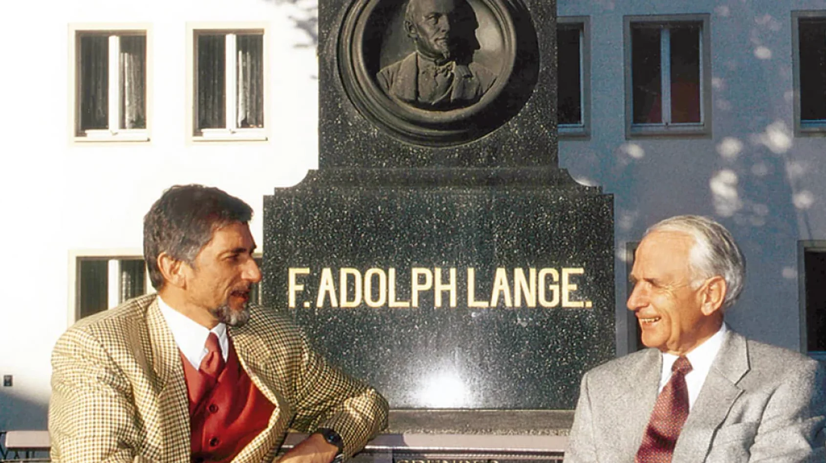 Hình ảnh: Günter Blümlein và Walter Lange ngồi trước một đài tưởng niệm dành cho ông cố của Walter, Ferdinand Adolph Lange
