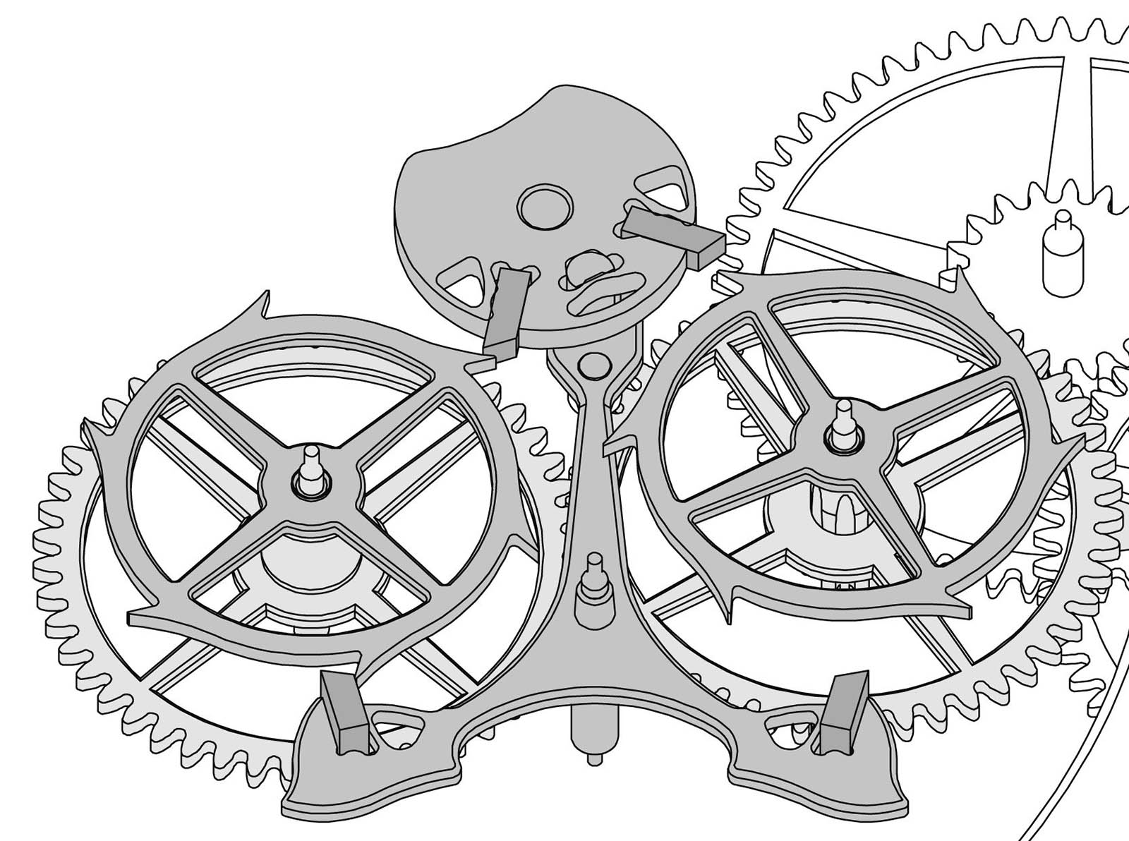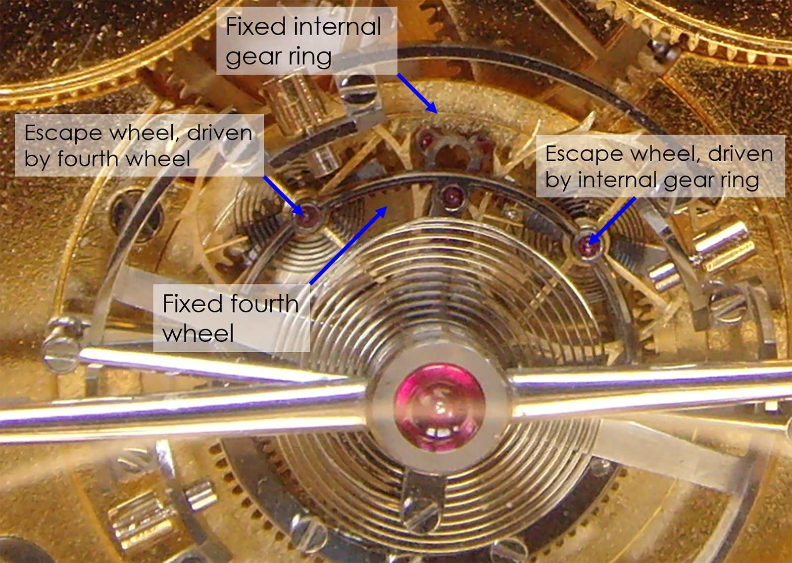 Ông không sử dụng hai hệ thống bánh răng riêng biệt, thay vào đó là hai bánh xe gai nhưng mỗi bánh xe sẽ xoay theo một hướng khác nhau. Ý tưởng này được lấy từ một phát minh khác của Breguet - Tourbillon.