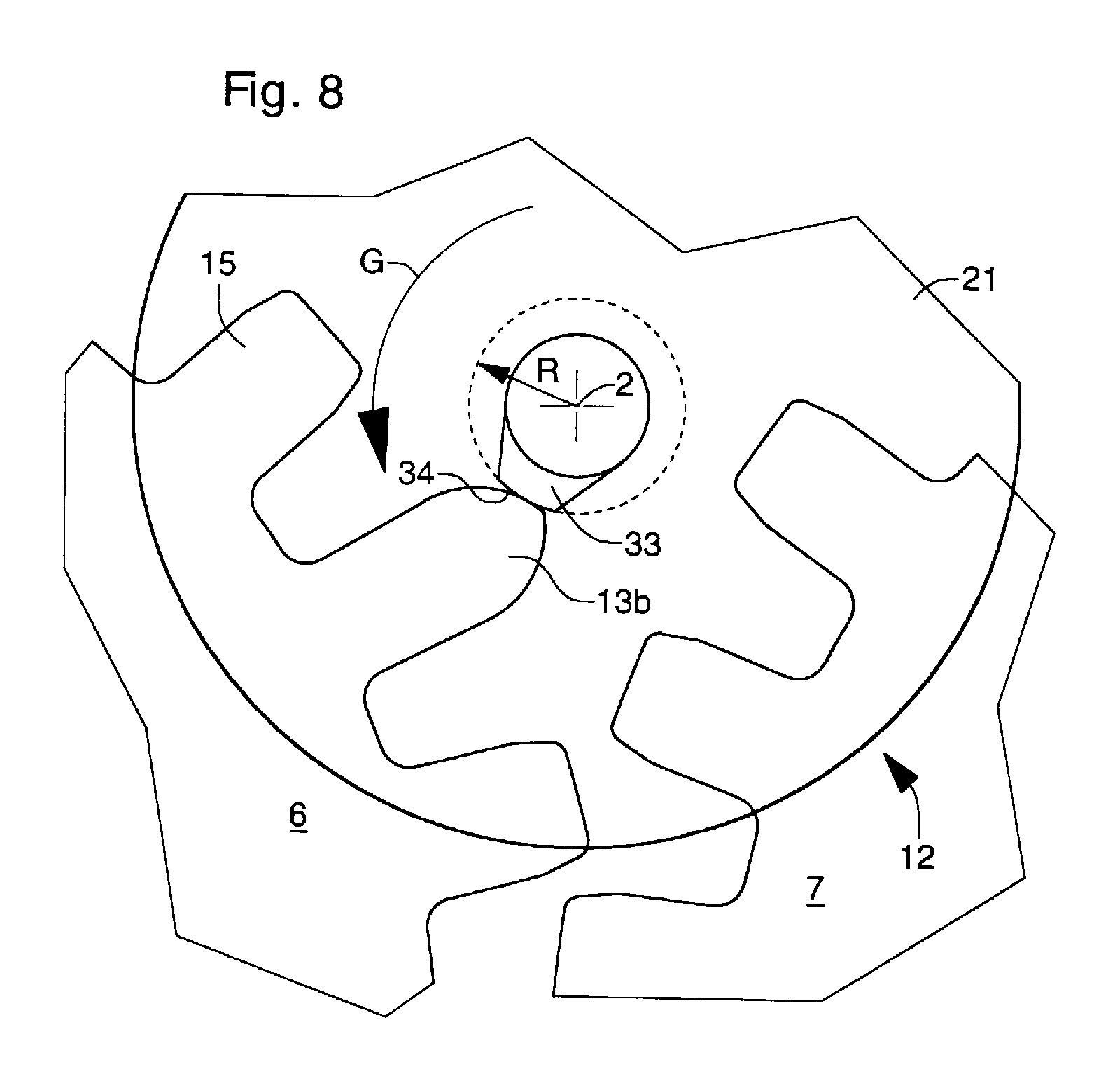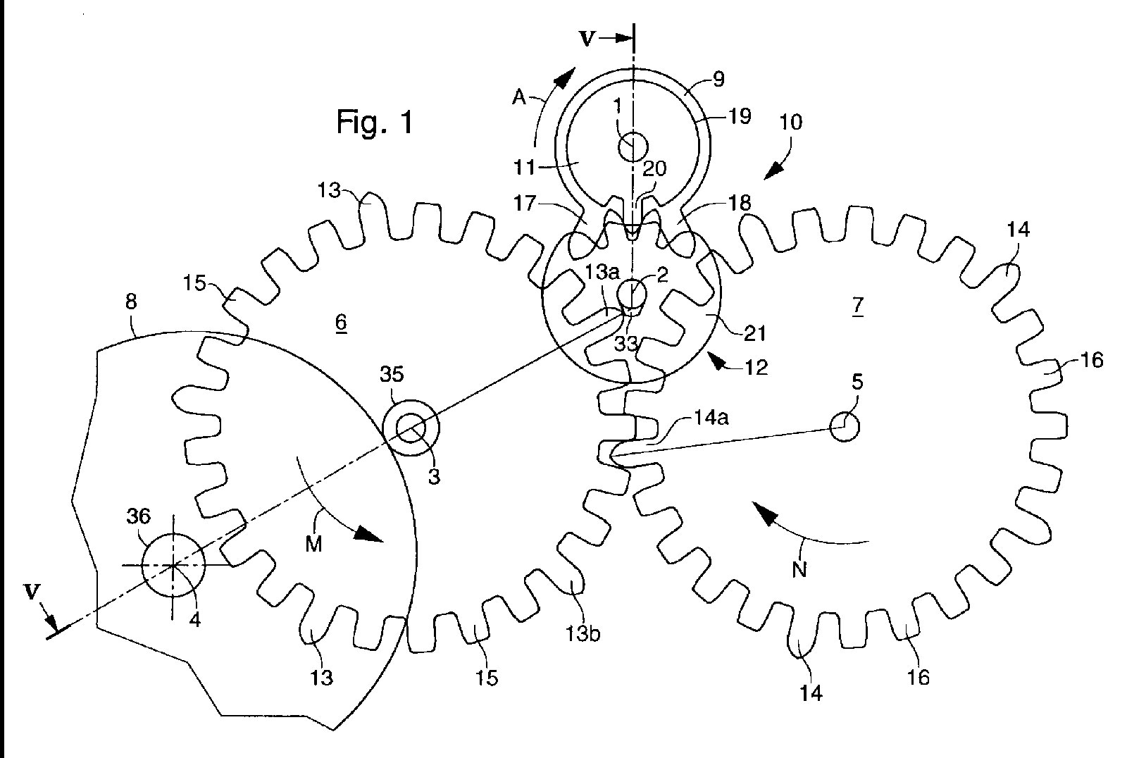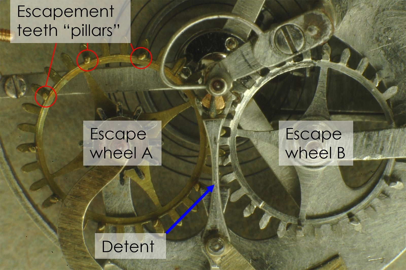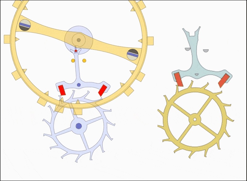 Cơ chế này cần sử dụng tới hai bánh xe gai xoay ngược chiều nhau, được kết nối bởi một bánh răng. Bạn có thể quan sát ảnh dưới, bánh xe gai A được truyền năng lượng từ hộp cót, trong khi đó bánh xe gai B lại lấy năng lượng từ bánh A.
