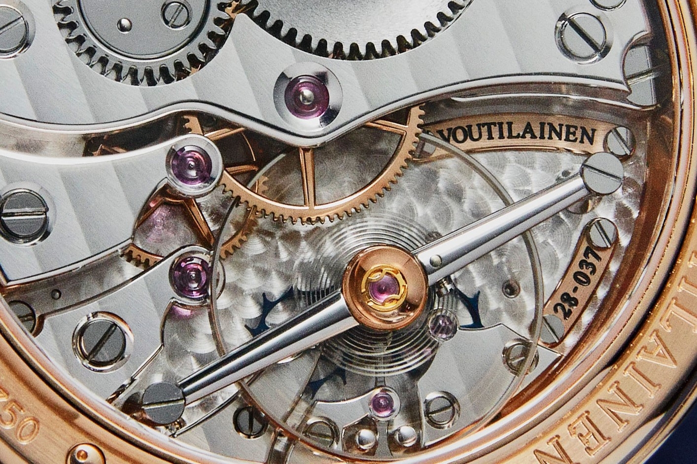 Một điểm đặc biệt khác ở bộ máy này là Voutilainen không sử dụng những chất liệu hiện đại như Silicon, mà chỉ sử dụng máy tiện CNC. Tất cả linh kiện đều được làm bằng đồng thau hoặc vàng, giúp việc bảo dưỡng cũng dễ dàng hơn. Linh kiện Silicon tuy có độ chính xác cao, nhưng việc chế tác và bảo dưỡng hiện cũng có nhiều vấn đề bất cập.