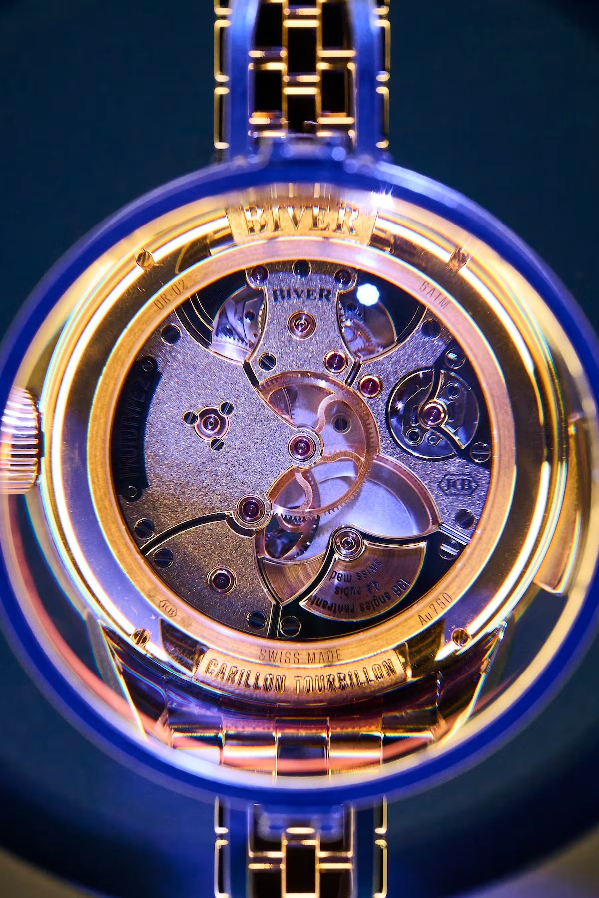 Chiếc đồng hồ có tên là Carillon Tourbillon Biver. Như tên gọi, mẫu đồng hồ có tourbillon, bộ điểm chuông carillon với một rotor siêu nhỏ với nhiều lựa chọn mặt số (các loại đá khác nhau). Trong ảnh là nguyên mẫu độc nhất vô nhị của JC Biver, chiếc đồng hồ sẽ được đem đi đấu giá tại Phillips.