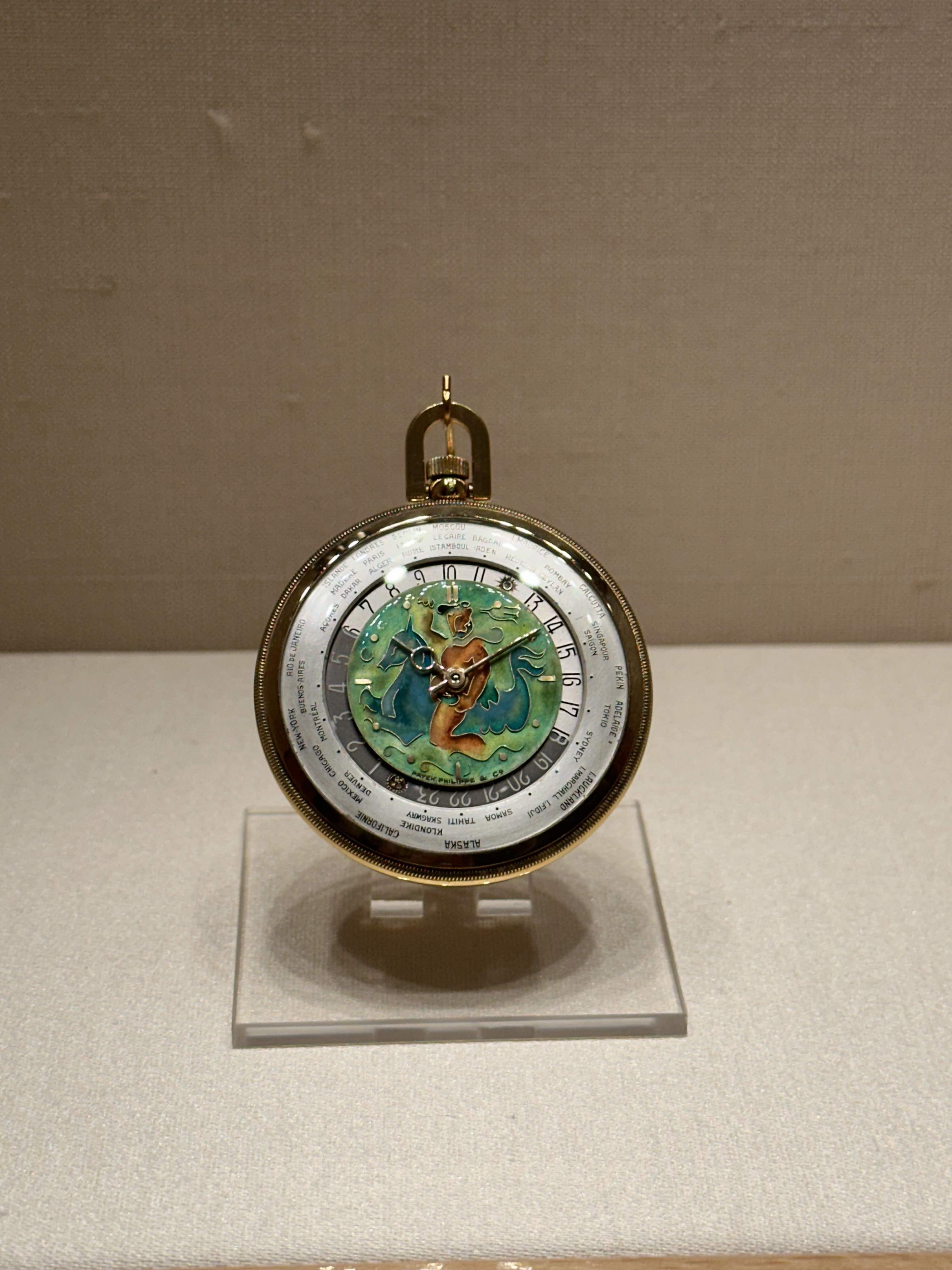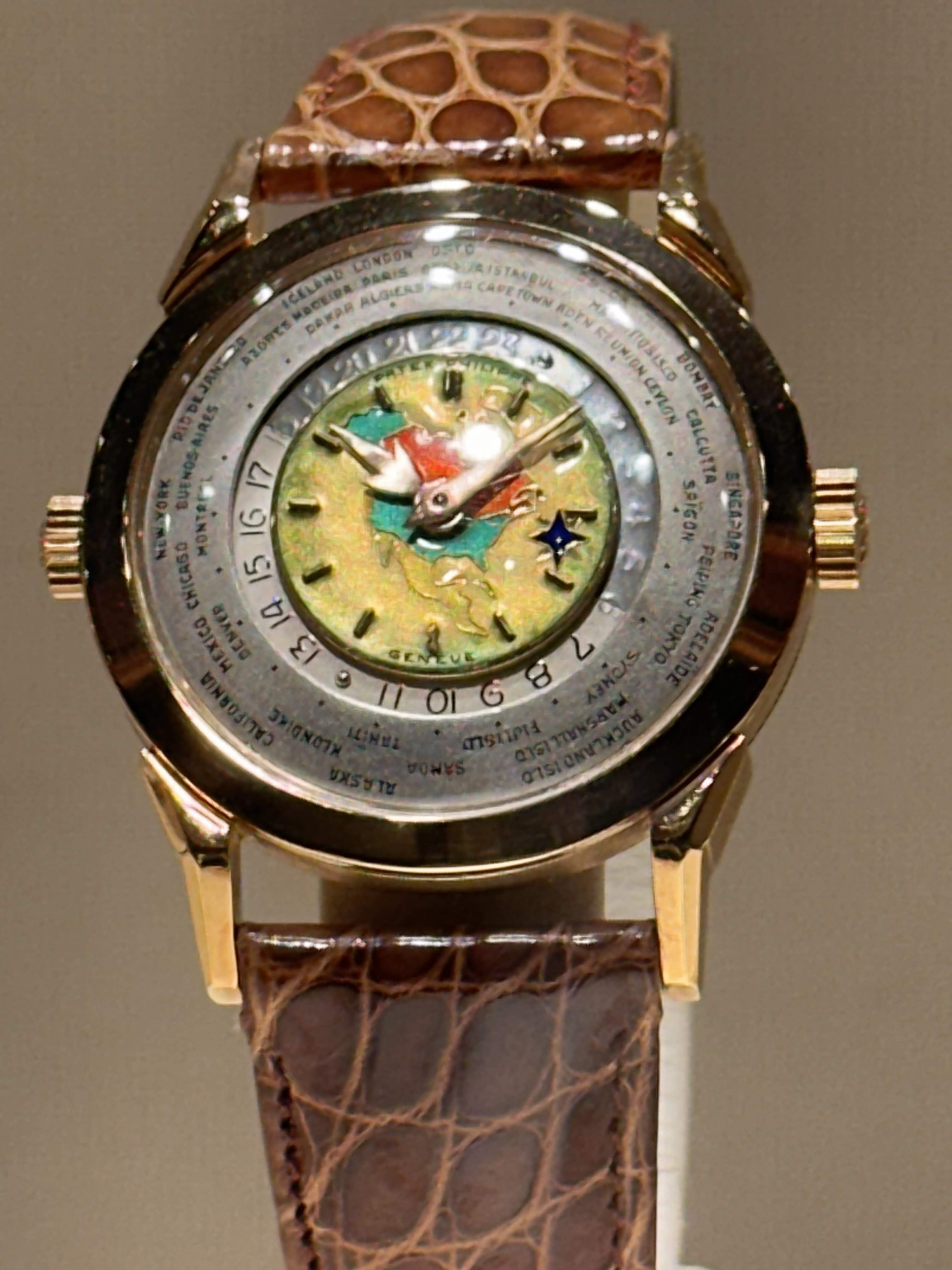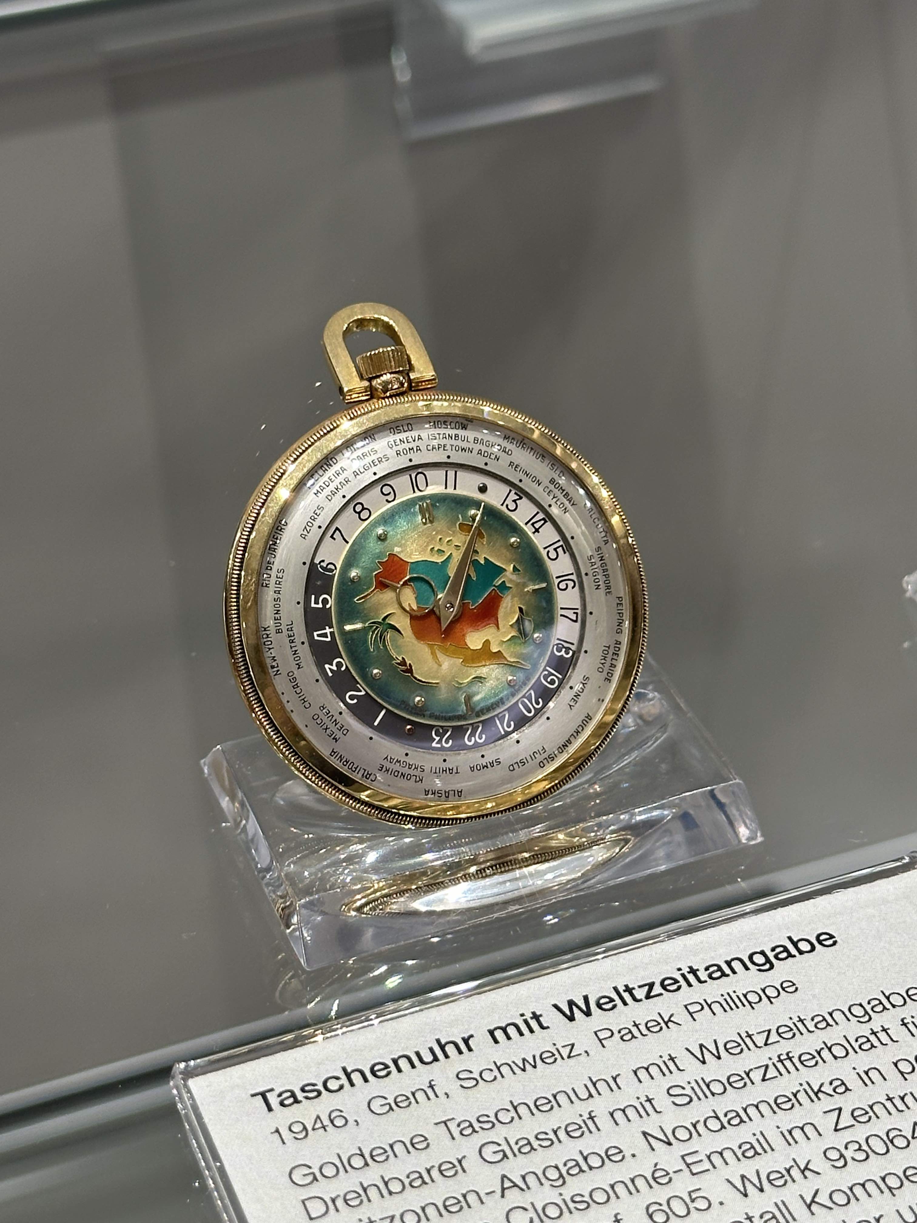 Chiếc đồng hồ bỏ túi Patek Philippe Ref. 605 HU được sản xuất từ năm 1946, là tác phẩm nghệ thuật thực sự với mặt số được trang trí bằng men cloisonné rực rỡ. Được thiết kế bởi ngài Louis Cottier, chiếc đồng hồ này có vòng tròn 24 giờ và đĩa có tên các thành phố hiển thị 24 múi giờ trên thế giới. Sự phức tạp của thiết kế này được tăng cường bởi bề mặt men cloisonné, kỹ thuật cầu kỳ mà mỗi bước thực hiện đều có nguy cơ làm hỏng tác phẩm, từ việc men có thể biến màu cho đến nứt vỡ. Tuy nhiên, khi hoàn thành, chúng phô diễn sự sống động của màu sắc có thể kéo dài hàng thế kỷ.