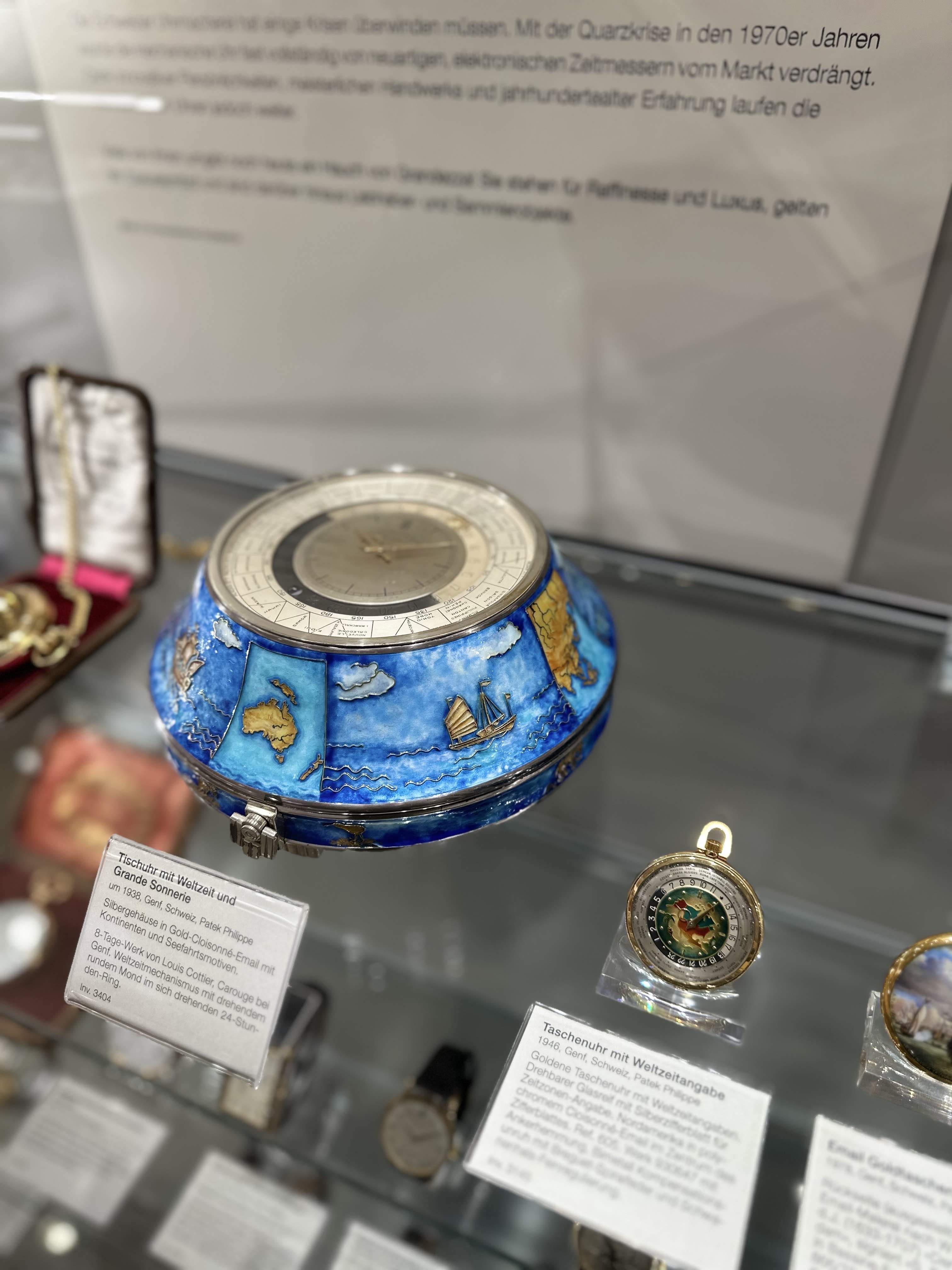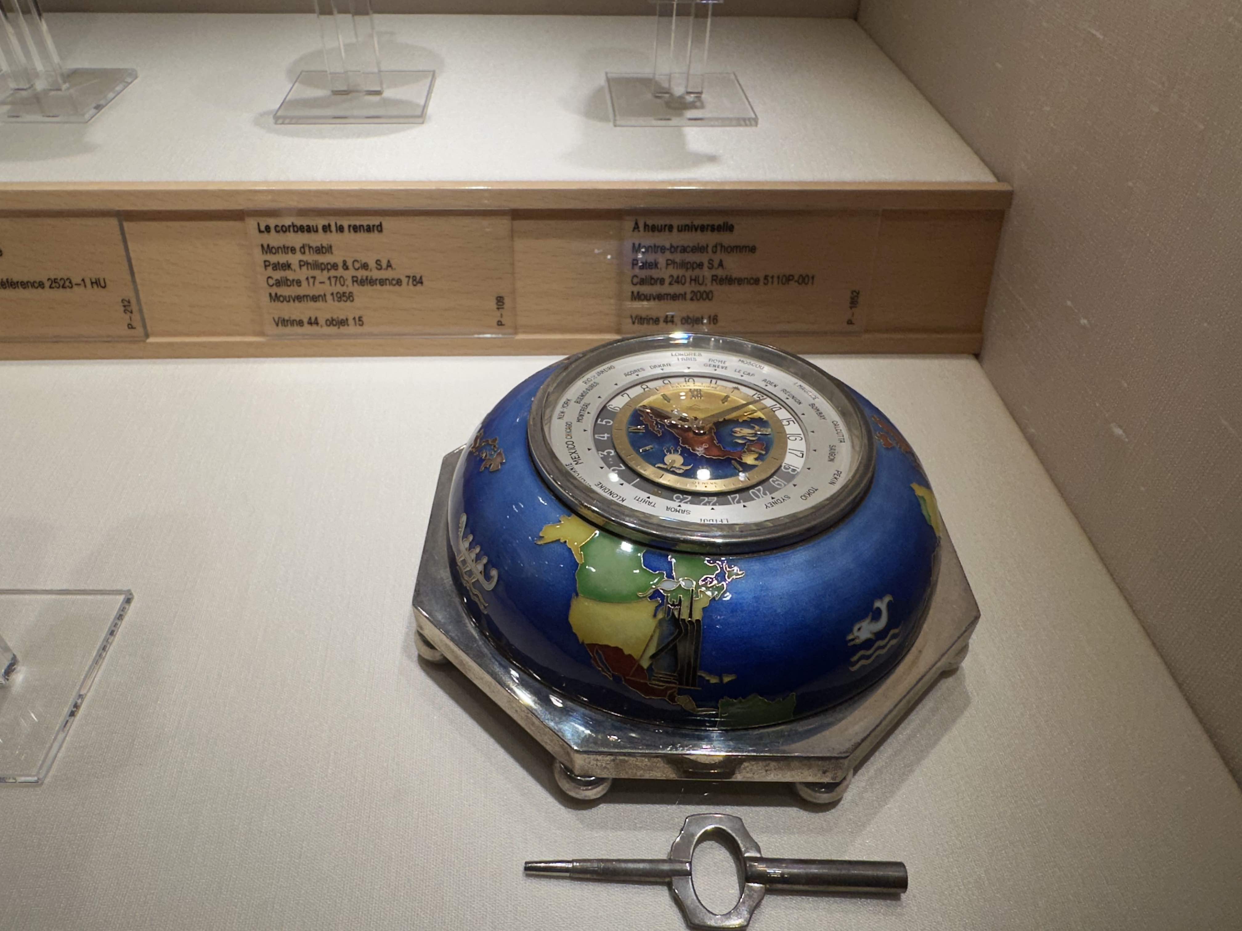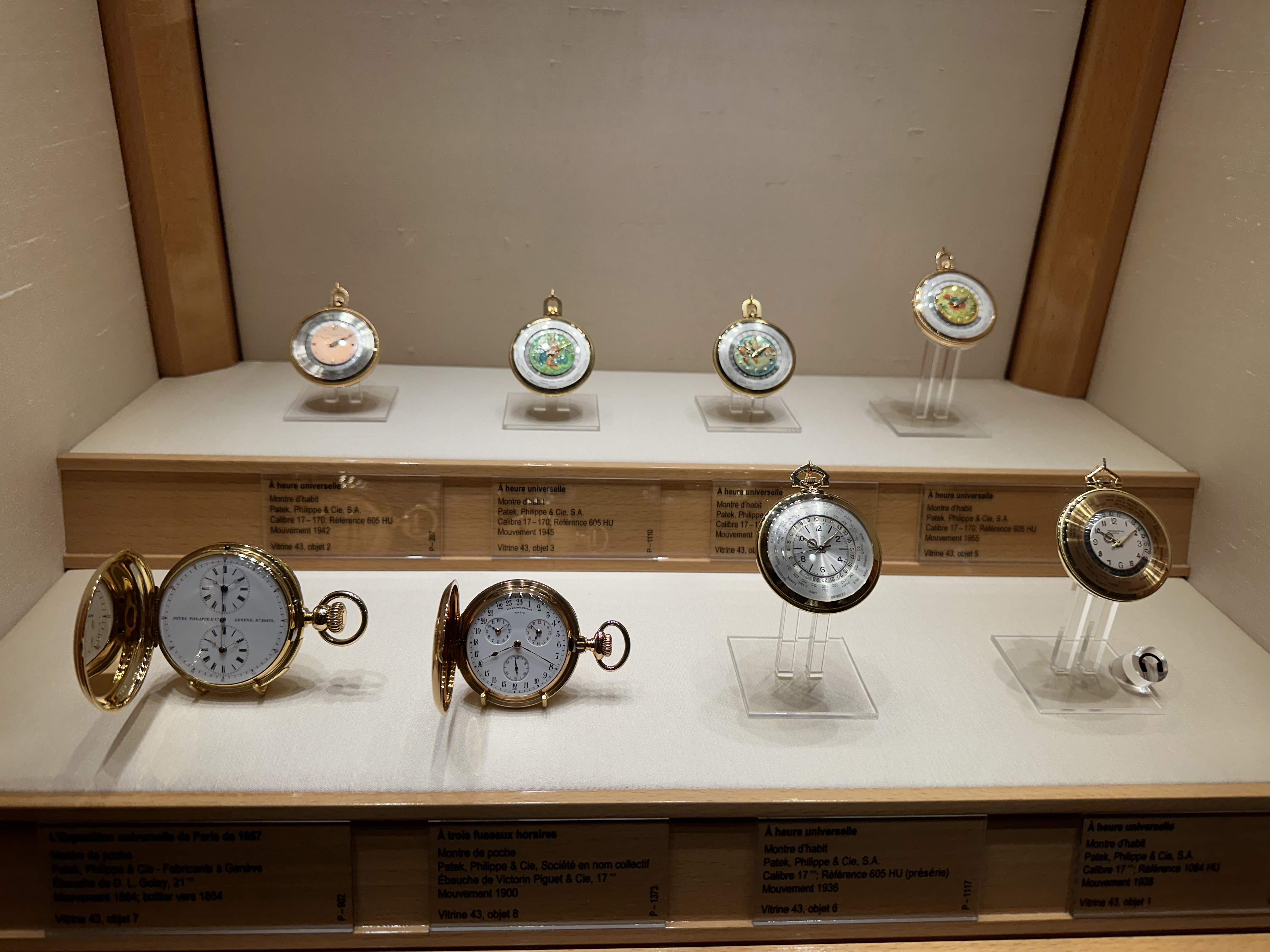 Hai chiếc đồng hồ đặc biệt – những tác phẩm của ngài Louis Cottier và Patek Philippe – nằm trang nghiêm trong khung kính. Những chiếc đồng hồ này không chỉ thể hiện thời gian ở các múi giờ khác nhau mà còn phản ánh một thời đại của sự sáng tạo không giới hạn trong nghệ thuật chế tác đồng hồ.
