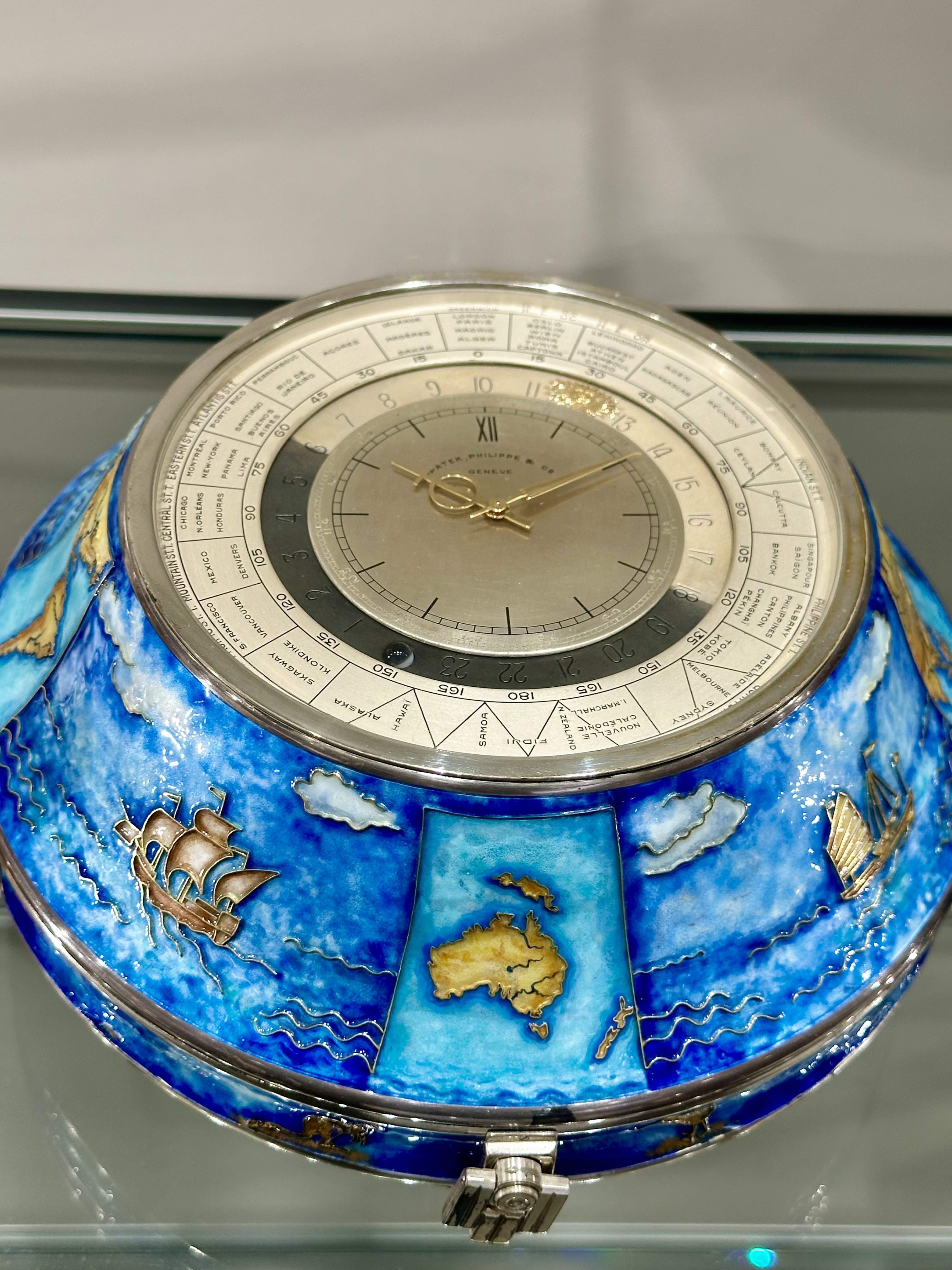Quá trình sản xuất đồng hồ World Time của Patek Philippe bắt đầu từ năm 1937, là kết quả cho mối quan hệ hợp tác giữa thương hiệu Patek Philippe và Nghệ Nhân Louis Cottier, nơi mỗi chiếc đồng hồ không đơn thuần chỉ là sản phẩm mà còn là tác phẩm nghệ thuật. Chiếc đồng hồ để bàn có chức năng Worldtime và điểm chuông ra đời năm 1938 minh chứng cho vẻ đẹp không tuổi và bất biến. Các chi tiết trên mặt số như biểu tượng mặt trời và mặt trăng, bức tiểu hoạ được thực hiện bằng men cloisonné bao bọc thân đồng hồ thể hiện hình ảnh những hải trình vượt đại dương qua các lục địa, vẻ đẹp của từng đường nét kim chỉ giờ, tất cả đều là kết quả của quá trình làm việc tỉ mỉ và đầy đam mê.