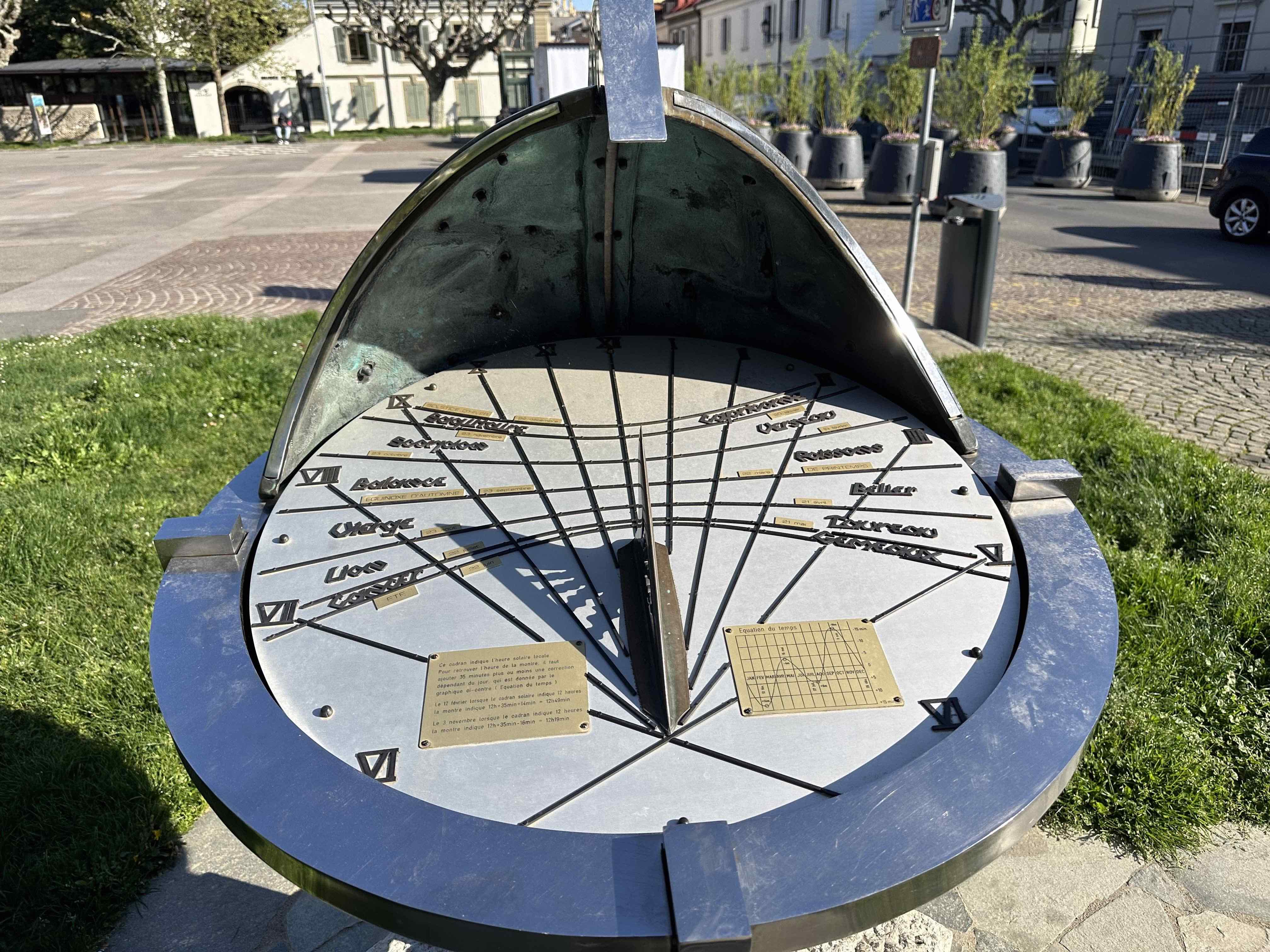 Đứng đó, bên cạnh quả địa cầu hình nón bằng đồng, tôi không khỏi suy ngẫm về sự vận động không ngừng của thời gian và những chuyển biến mà nó mang lại cho chúng ta. Quả địa cầu này là đồng hồ mặt trời - thiết bị cổ xưa dùng để xác định thời gian bằng cách sử dụng vị trí của mặt trời. Bóng của thanh kim (gọi là gnomon) sẽ di chuyển và rơi trên các đường chỉ giờ, cho thấy giờ trong ngày. Tấm bảng "Equation du Temps" hoặc "Phương trình thời gian" là bảng tham chiếu sử dụng trong đồng hồ mặt trời để điều chỉnh sự chênh lệch giữa "thời gian mặt trời thật" (còn gọi là thời gian mặt trời địa phương) và "thời gian mặt trời trung bình" (thời gian theo đồng hồ). Do hình dạng quỹ đạo elip của Trái Đất quanh Mặt Trời và sự nghiêng của trục quay của Trái Đất, thời gian mặt trời thật (thời gian từ khi mặt trời ở điểm cao nhất trên bầu trời từ ngày này sang ngày khác) không đồng đều. Tấm bảng này giúp người đọc có thể xác định thời gian chính xác hơn. Cụ thể vào thời điểm tôi chụp bức ảnh này là 9.51 phút sáng áp dụng giờ tiết kiệm ánh sáng/ giờ mùa hè (ký hiệu: DST – điều chỉnh + 1 giờ so với giờ địa phương, áp dụng từ cuối tháng 3 đến cuối tháng 11) so sánh với giờ hiển thị trên đồng hồ mặt trời/ giờ địa phương khoảng 8.56 phút và trừ đi theo phương trình thời gian khoảng 3 đến 4 phút cho kết quả cận chính xác (sai lệch chỉ từ 1 đến 3 phút).