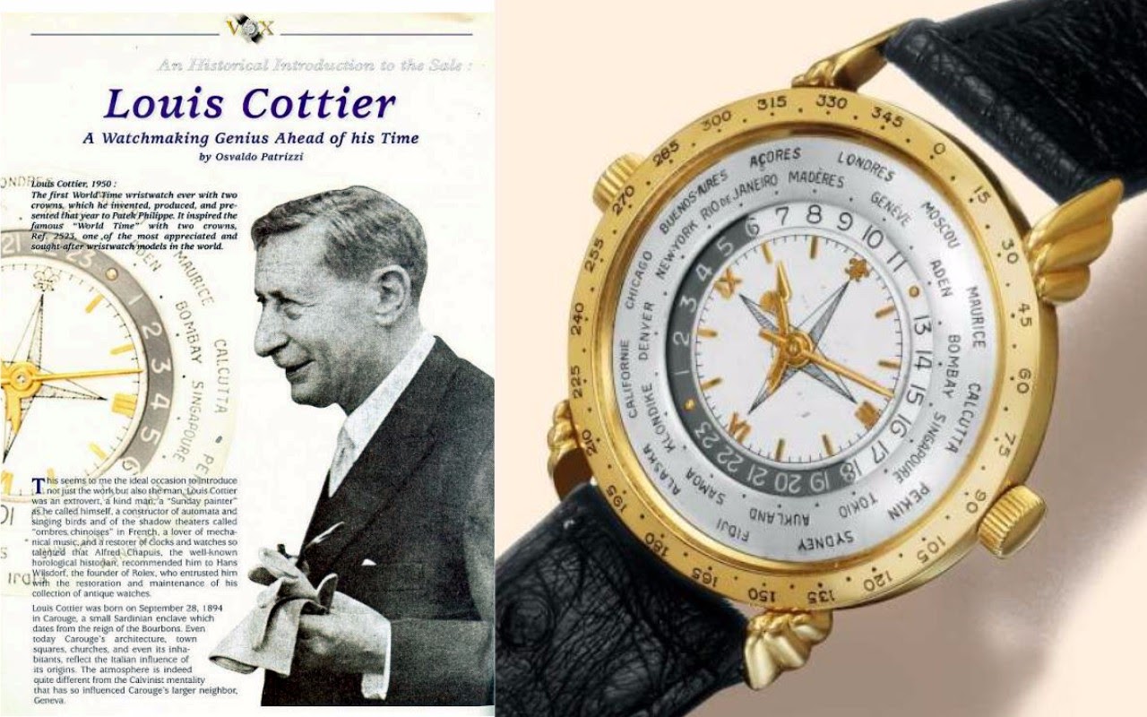 Louis Cottier, sinh năm 1894 tại Carouge, đã từng là tâm điểm của giới chế tác đồng hồ Thụy Sĩ. Ông đã làm thay đổi cục diện ngành chế tác khi phát triển cơ chế hiển thị múi giờ toàn cầu (World Time) cho đồng hồ đeo tay. Cơ chế này dựa trên một đĩa xoay bên ngoài hoặc bao quanh mặt số, khắc tên các thành phố đại diện cho từng múi giờ, cho phép người đeo xác định thời gian ở bất kỳ nơi nào trên thế giới một cách trực quan.