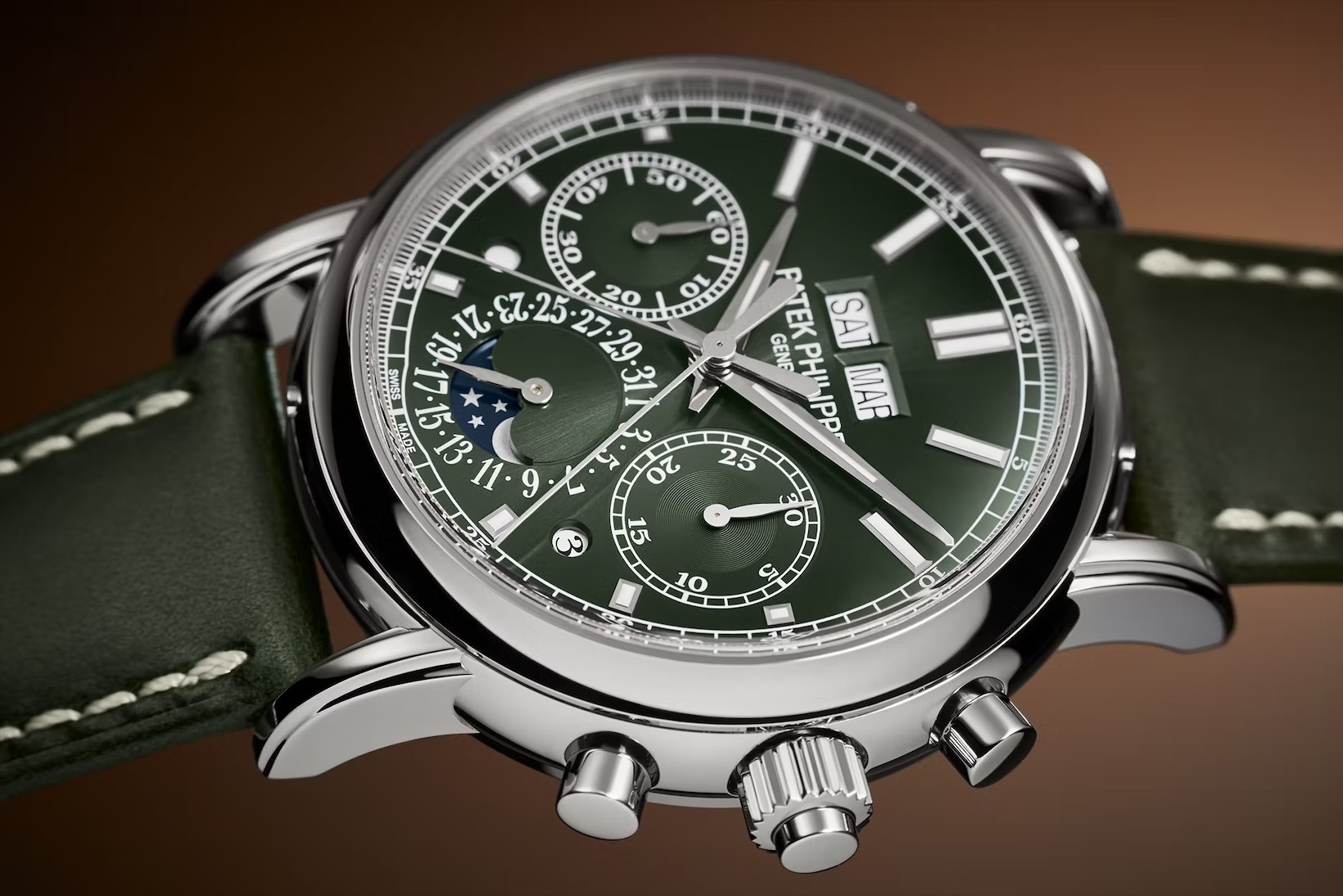 Trước khi ra mắt phiên bản vàng trắng trong năm nay, Patek Philippe Grand Complications 5204R bằng vàng hồng đã tồn tại được 10 năm, năm 2012. Vào năm 2021, nhà sản xuất vùng Geneva đã cập nhật mặt số màu xám cho mẫu đồng hồ này. Còn phiên bản mới nhất, Patek Philippe ref. 5204G lại sở hữu vỏ bằng vàng trắng và mặt số màu xanh ôliu mới mẻ, có hoàn thiện dạng sunburst (chải tia). Bên trong đồng hồ là bộ máy lịch vạn niên di sản của thương hiệu, cùng chia sẻ với ref. 2499 cũng như ref. 5270 nhưng lại được thêm vào cơ chế split-seconds chronograph. Sự kết hợp của vàng trắng, kim và cọc phủ chất phát quang đưa đến cảm giác khiêm tốn, rất cơ bản, che khuất đi sự phức tạp cực kỳ bên dưới.