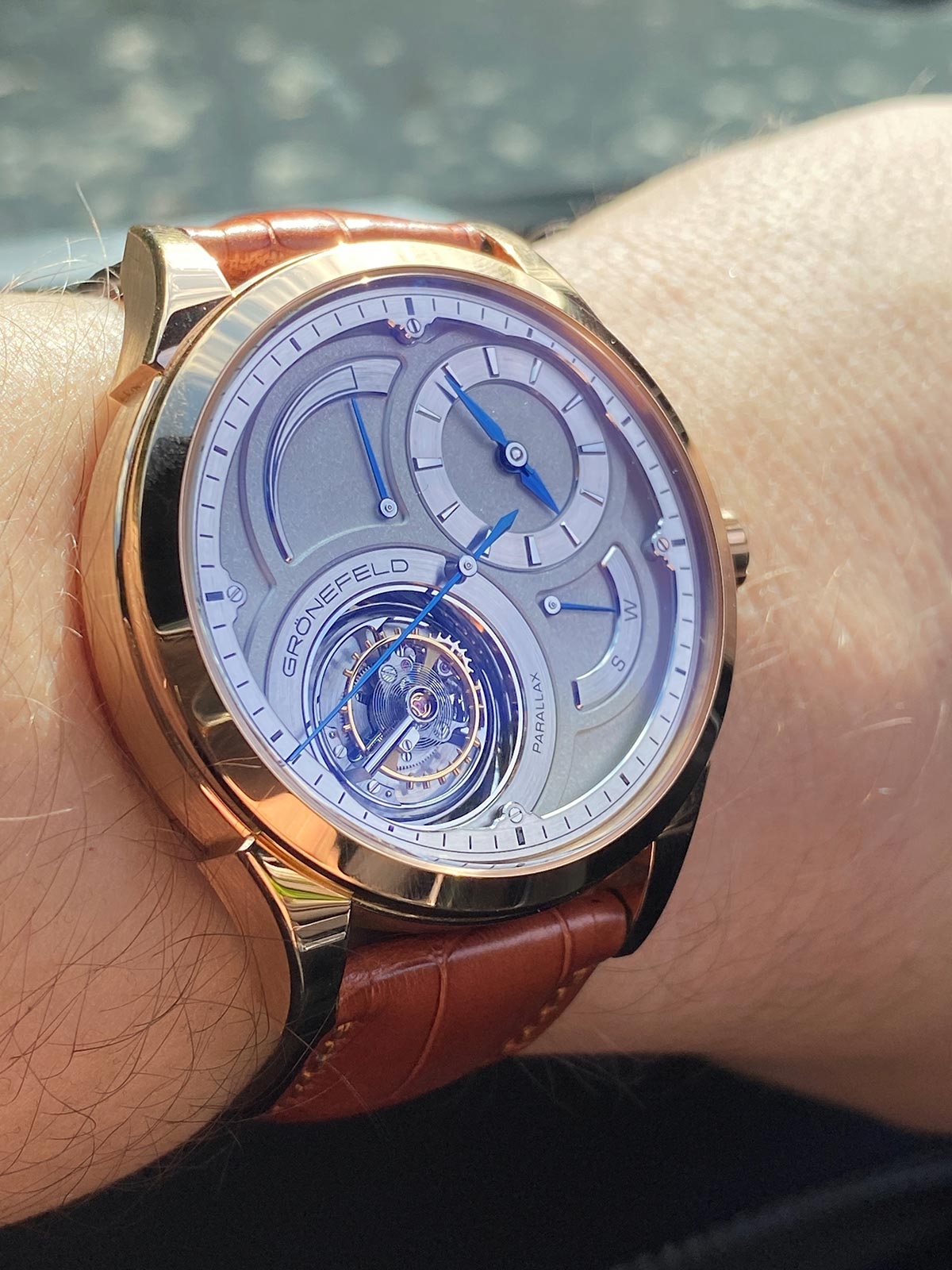 Parallax Tourbillon là một đại diện thể hiện kỹ năng tốt nhất của Grönefeld. Sự đầu tư của hai anh em nhà Grönefeld vào Parallax Tourbillon đã không uổng khi chiếc đồng hồ này được trao giải thưởng đồng hồ tourbillon tốt nhất tại Grand Prix d'Horlogerie de Genève, hay GPHG danh giá.