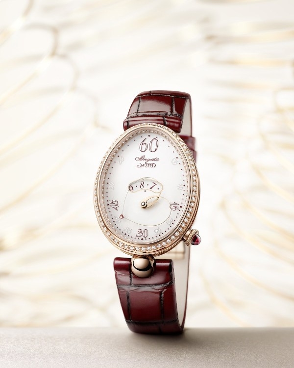 Tương tự chiếc đồng hồ Tradition Dame 7038 ra mắt năm 2020, chiếc Reine de Naples Cœur đi kèm dây đeo bằng da màu đỏ lộng lẫy, nổi bật với nó là phần móc cài hình quả trứng, tương xứng với dáng vỏ đặc biệt. Được sản xuất giới hạn 28 chiếc, đồng hồ Breguet Reine de Naples Cœur 9825 có giá bán lẻ là 46.100 USD.