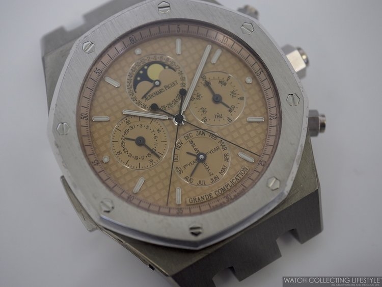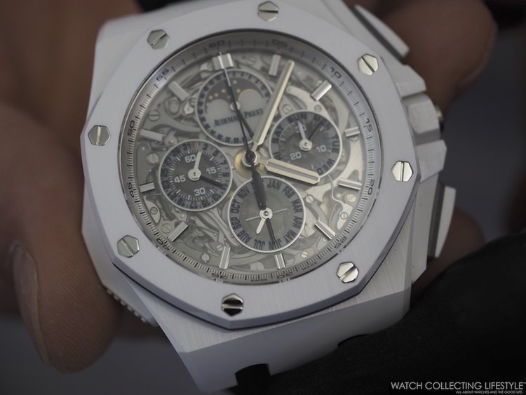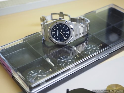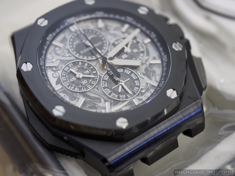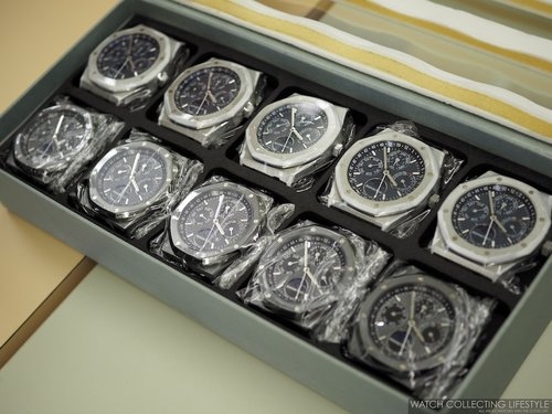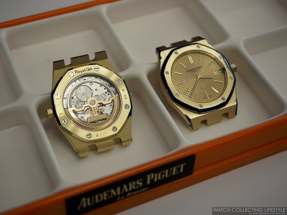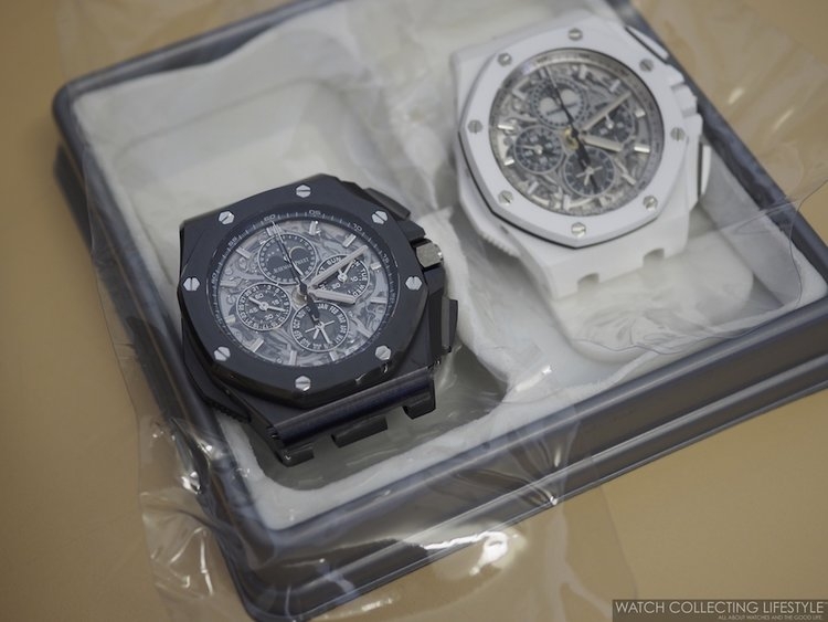 Tại đây, chúng tôi được chiêm ngưỡng một số thiết kế siêu hiếm như chiếc Royal Oak Jumbo Extra-Thin mang mã hiệu 15202ST phiên bản thép, hay 15202BA với lớp vỏ vàng vàng đi kèm mặt số Champagne. Cùng với đó là một khay đầy Royal Oak Perpetual Calendars bản Ceramic đen và thép, cộng với một số chiếc Royal Oak Perpetual Calendar đặc biệt cho thị trường Nam Mỹ mang mã hiệu 26584OR.OO.1220OR.01.