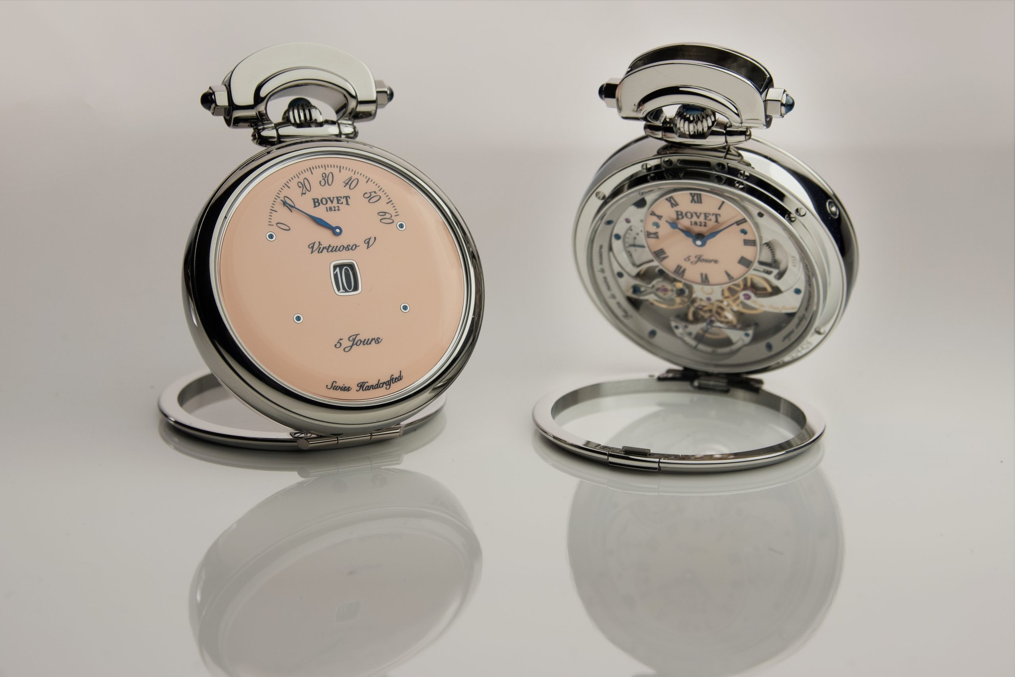 Trên thực tế, Bovet Amadéo Fleurier Virtuoso V là một sản phẩm cao cấp đa năng, có thể là đồng hồ đeo tay, có thể là đồng hồ quả quýt, hay một chiếc đồng hồ để bàn trang trí thật phong cách.