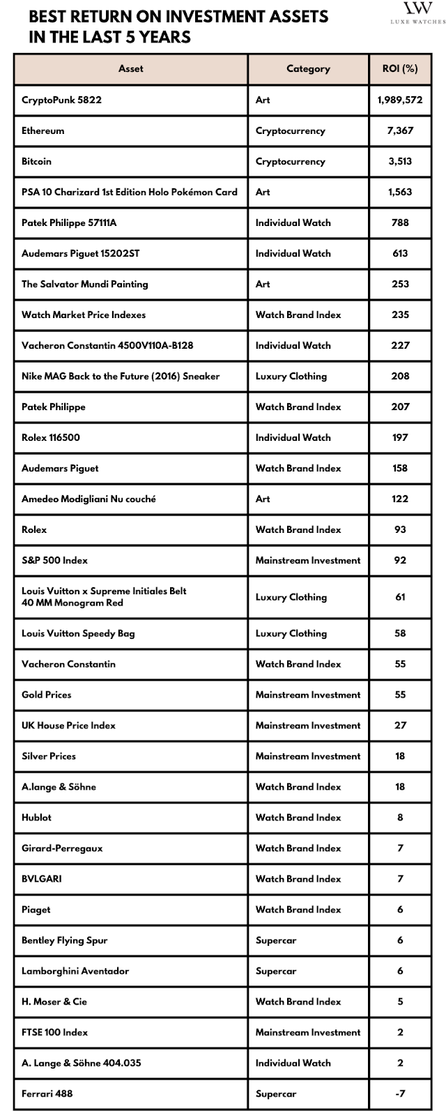 Dưới đây là dữ liệu tổng hợp và phân tích liên quan đến nhiều loại tài sản bao gồm cổ phiếu, tiền điện tử, kim loại quý, tác phẩm nghệ thuật và các mặt hàng xa xỉ bao gồm cả đồng hồ, để tìm ra loại nào có ROI tốt nhất trong 5 năm qua.