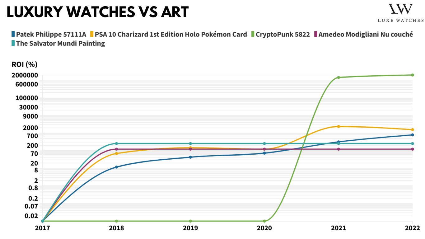 Khi so sánh tác phẩm nghệ thuật với Patek Philippe 5711A - chiếc đồng hồ tốt nhất xét về ROI, chúng tôi thấy rằng có sự gia tăng ổn định, điều đó có nghĩa đây là một lựa chọn đầu tư an toàn hơn nhiều so với tính chất dễ bay hơi của các khoản đầu tư nghệ thuật. Patek Philippe 5711A đã mang lại ROI là 788% trong 5 năm qua, điều đó có nghĩa là nó xếp thứ 5 trong danh sách tổng thể.