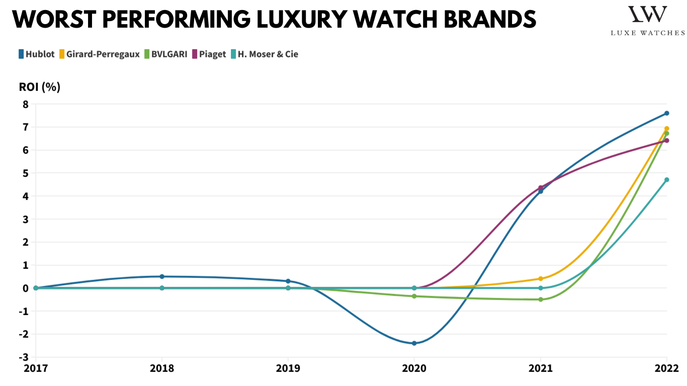 Hublot đã cho thấy ROI 8%, thấp hơn 12 lần so với Rolex và 26 lần so với Patek Philippe. Chúng tôi cũng thấy ROI ở mức khiêm tốn, từ 5% đến 8% đối với các thương hiệu như Girard-Perregaux, BVLGARI, Piaget và H. Moser & Cie. Tỷ lệ này cao hơn các loại tài sản khác, chẳng hạn như bất động sản, nhưng vẫn thấp hơn nhiều so với các thương hiệu đồng hồ khác trên thị trường.