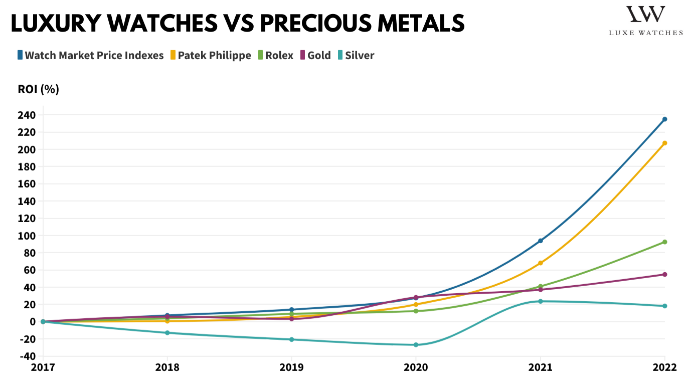 Nếu muốn phòng ngừa lạm phát, vàng bạc là lựa chọn tuyệt vời, nhưng rõ ràng ROI của loại tài sản này không phải tốt nhất. Trong 5 năm qua, tổng thể thị trường đồng hồ xa xỉ mang lại ROI gấp bốn lần so với vàng và gấp 12 lần so với bạc.