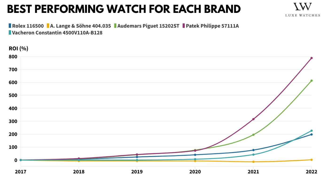 Rolex có thể là thương hiệu đồng hồ xa xỉ nổi tiếng nhất, nhưng lại không phải là khoản đầu tư mang lại lợi nhuận cao nhất. Vị trí số một thuộc về Patek Philippe với ROI là 207% trong 5 năm qua. Rolex, có ROI đạt 93% trong 5 năm qua, thậm chí không chiếm vị trí thứ hai. Vinh dự đó thuộc về Audemars Piguet, mang lại lợi nhuận trung bình 158%. Vacheron Constantin đứng ở vị trí thứ 4 với ROI là 55% và A.Lange & Söhne đứng thứ 5 với ROI là 18% trong 5 năm qua.