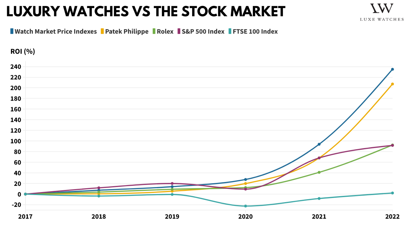 So sánh hiệu suất của thị trường đồng hồ xa xỉ thứ cấp với cổ phiếu, chúng tôi thấy rằng ROI mà đồng hồ Patek Philippe đem lại vượt trội so với hai trong số các chỉ số thị trường chứng khoán phổ biến nhất - S&P 500 và FTSE 100.