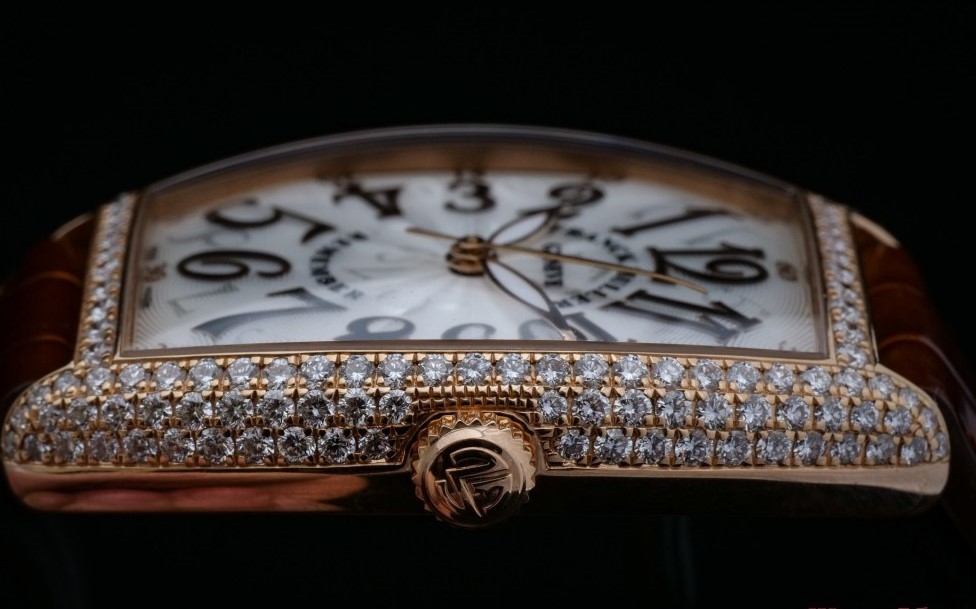 Cả hai phiên bản đều có cùng thiết kế núm chỉnh giờ: đều được làm từ vàng hồng nguyên khối, tạo khía giúp người dùng dễ dàng sử dụng. Ở phần đầu núm, chúng ta có logo của thương hiệu Franck Muller được dập nổi hết sức đẹp mắt và sắc sảo.